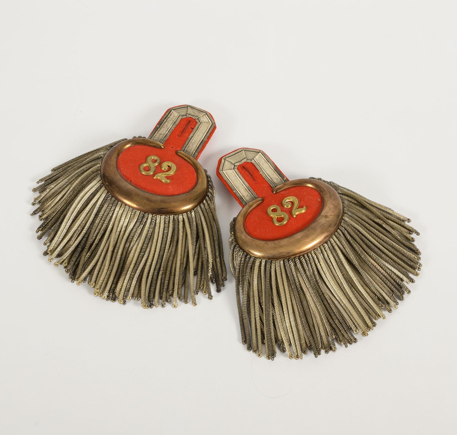 Major's epaulettes of the "2nd Hessian Infantry Regiment No. 82", with twisted canteens, red cloth. In original box. Good condition, one with small moth holes.