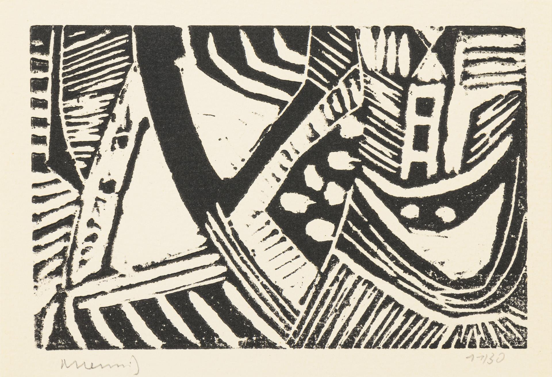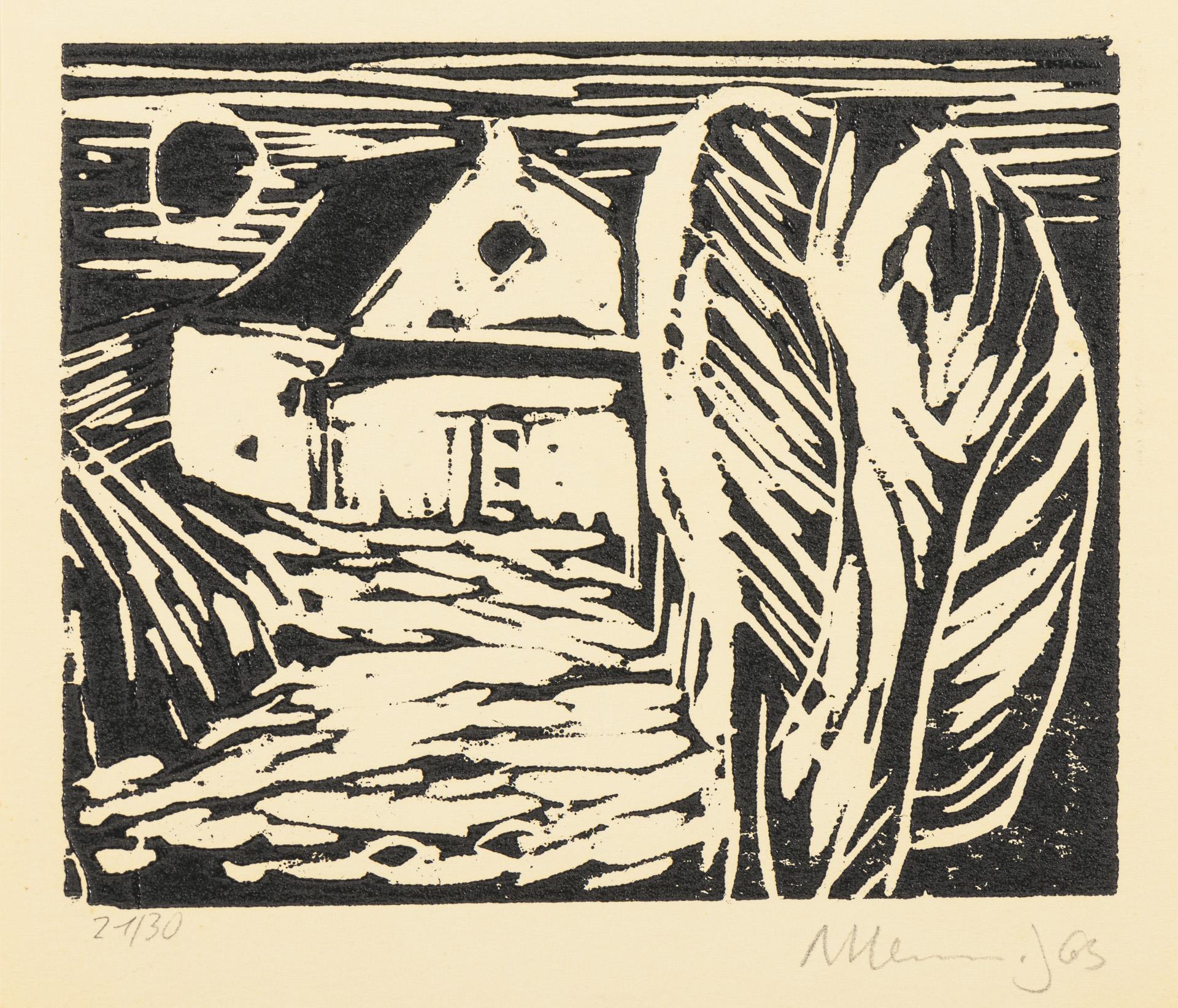 Portfolio with 10 original woodcuts, hand-printed, numbered 1/5 (edition of 30 copies and 5 preferred copies). Complete, one colored woodcut framed. Sheets with different edition numbers.