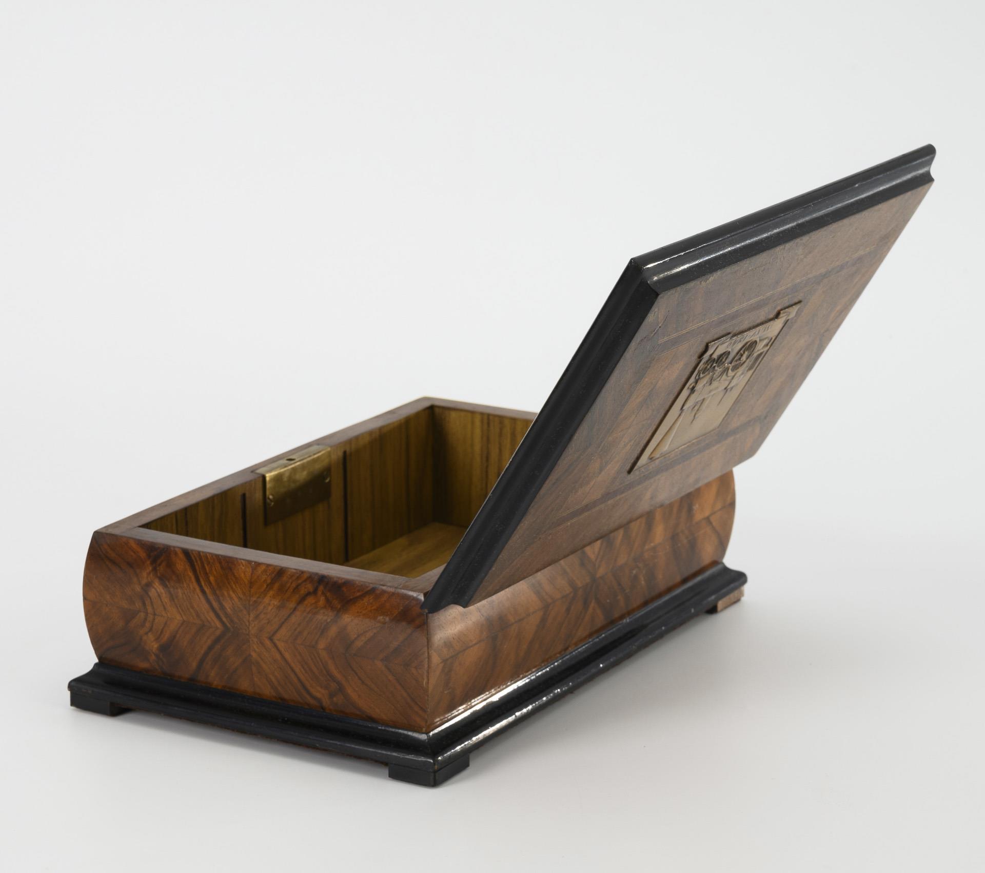 Walnut veneered/marked, brass plaque, ebonized strips, imitation veneer (printed plastic) inside. 9.5 x 27 x 18 cm.