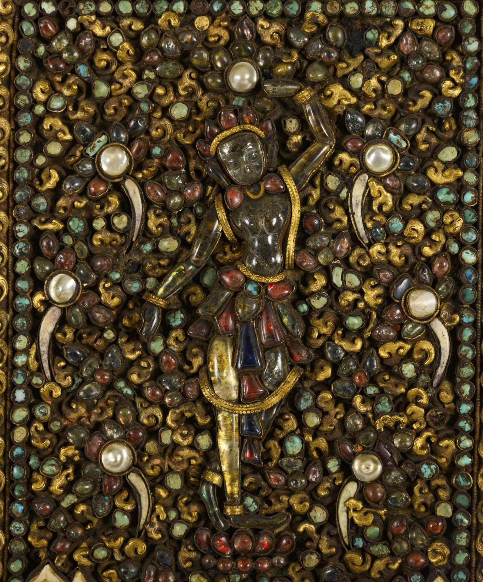 Picture plate with standing Buddha figure, composed of different colored, individually set glass stones as well as bone, pearls and turquoise. Parts of the body probably made of rock crystal. In a partially decorated metal frame. The back closed by a stamped metal plate, marked "P.H. Muntz's, 1867". Some small stones missing.