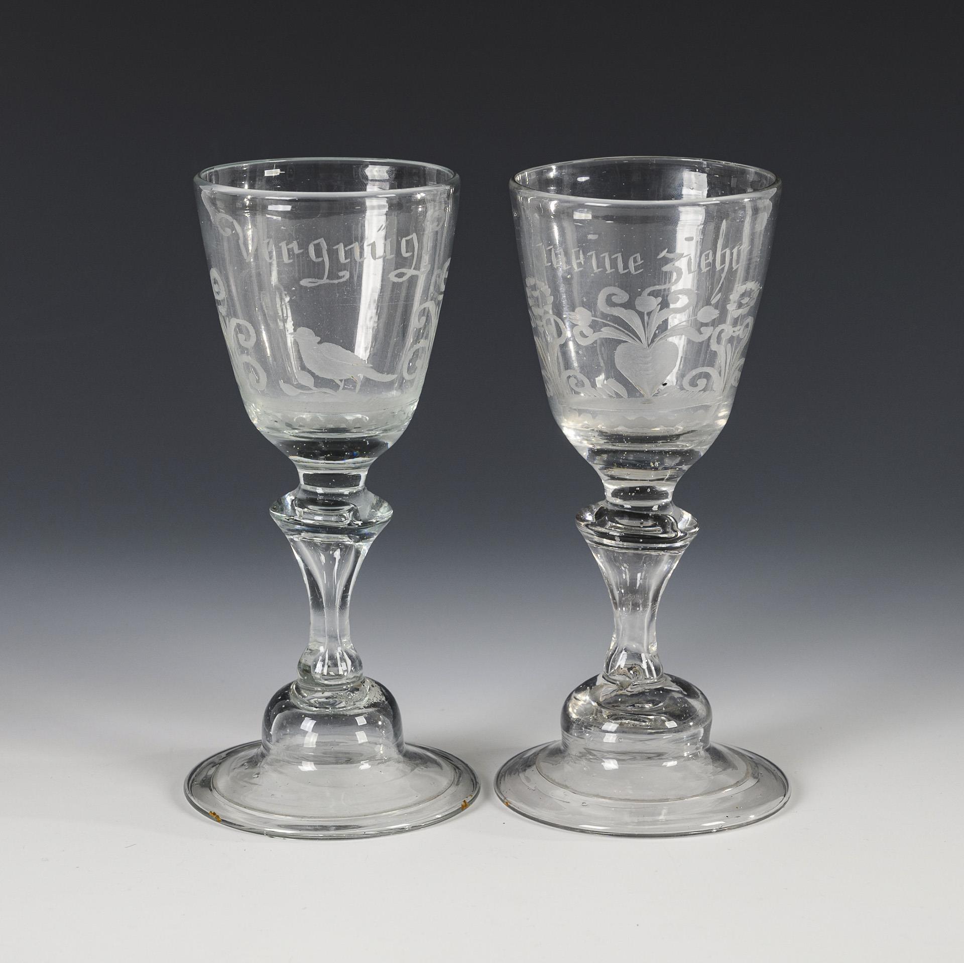 Conical bowl, hollow baluster stem, base with turned-down rim; pontil mark. Engraved floral pattern on the bowl and the inscription "Vergnügt" or "meine ziehr".