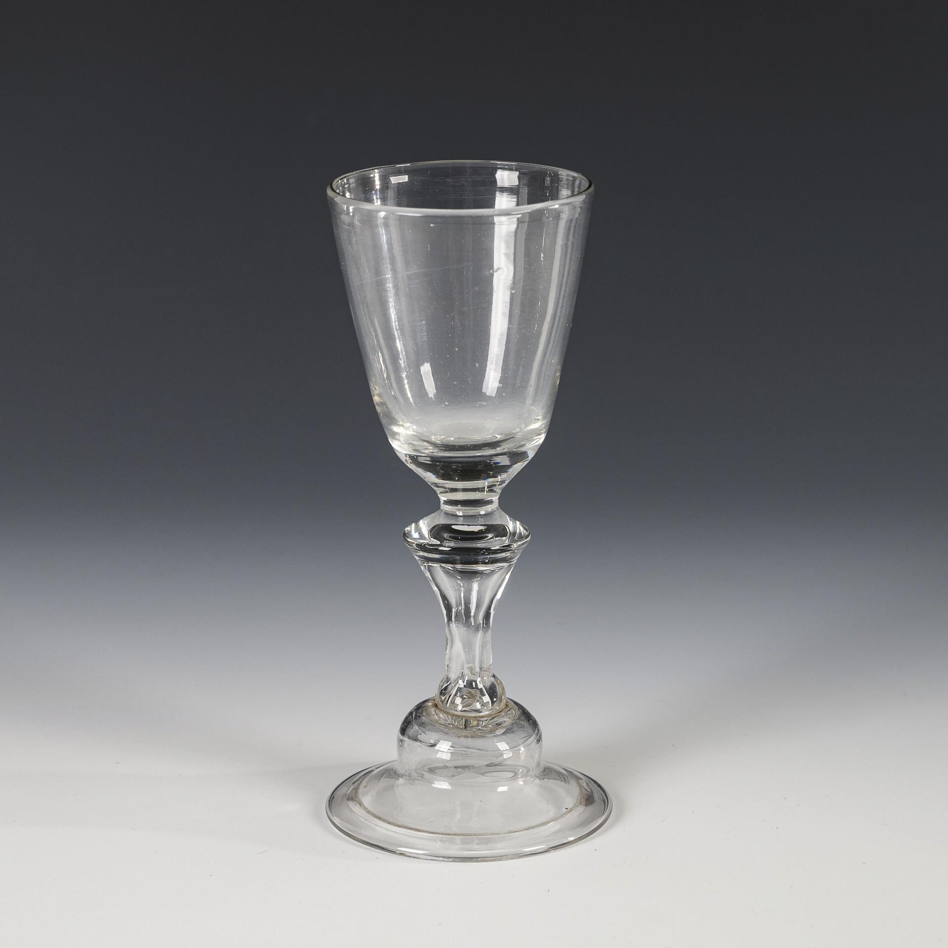 Bell-shaped cup, baluster shaft with pierced air bubble, hat foot with turned-down rim; pontil mark.