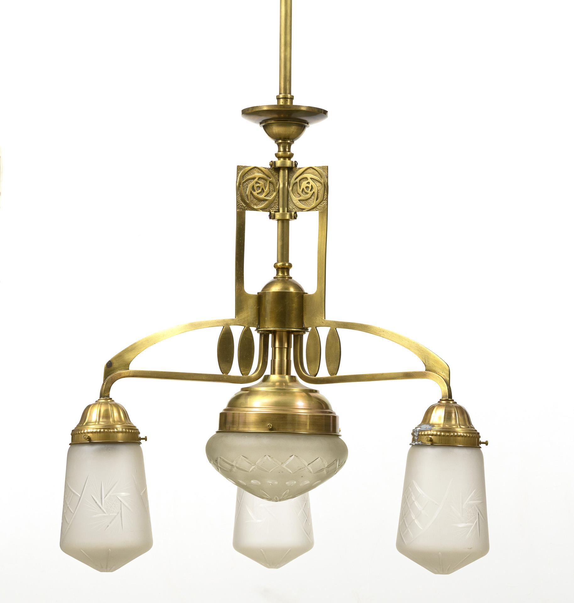 3 closed lampshades on the 3 arms with decorative elements, some in floral relief, as well as a central lampshade on the shaft with whorls and canopy. Functioning.