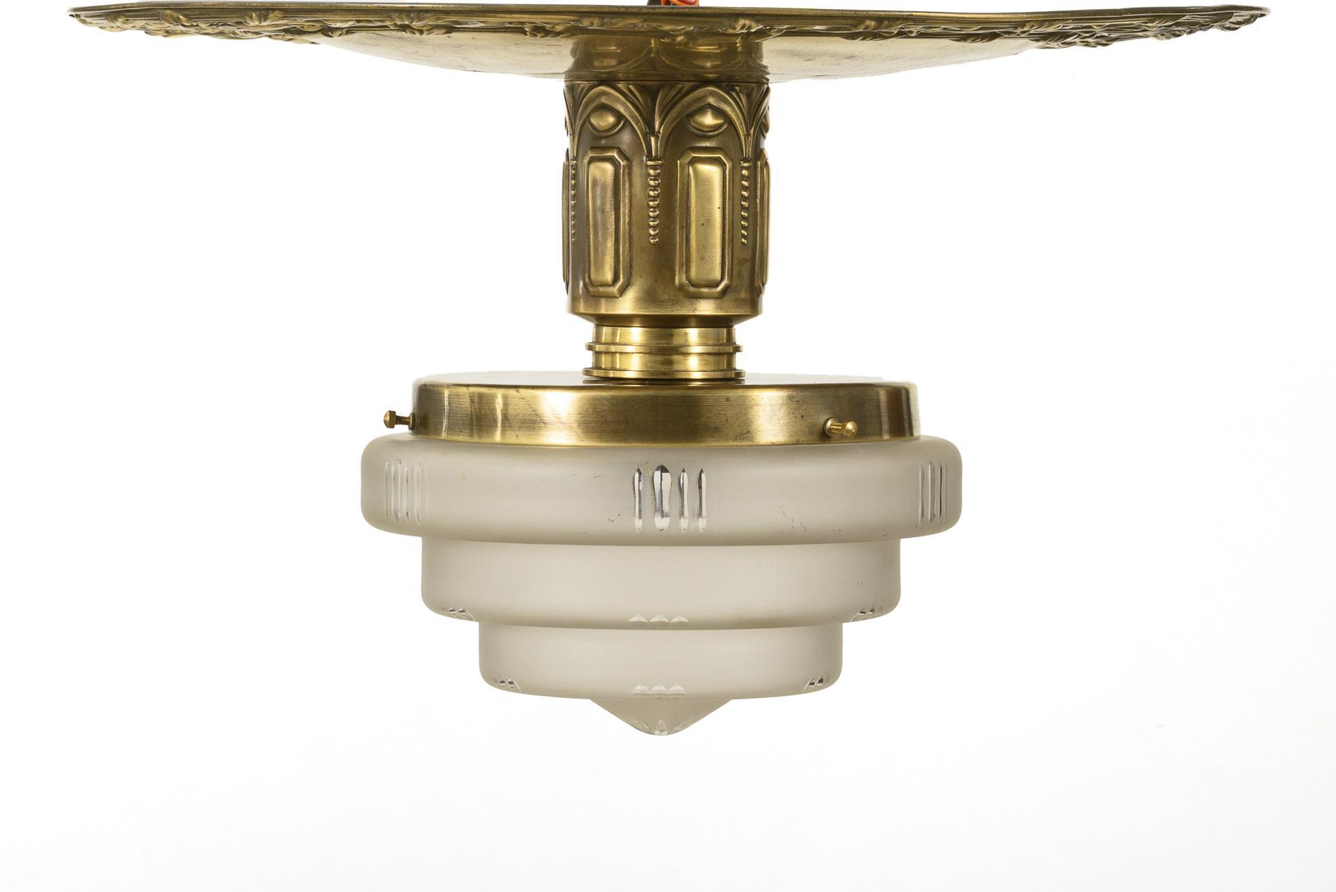 Brass embossed, satin-finished colorless glass with notch cut, electrification with screw socket. H 31 cm, Ø 48 cm, Ø shade.