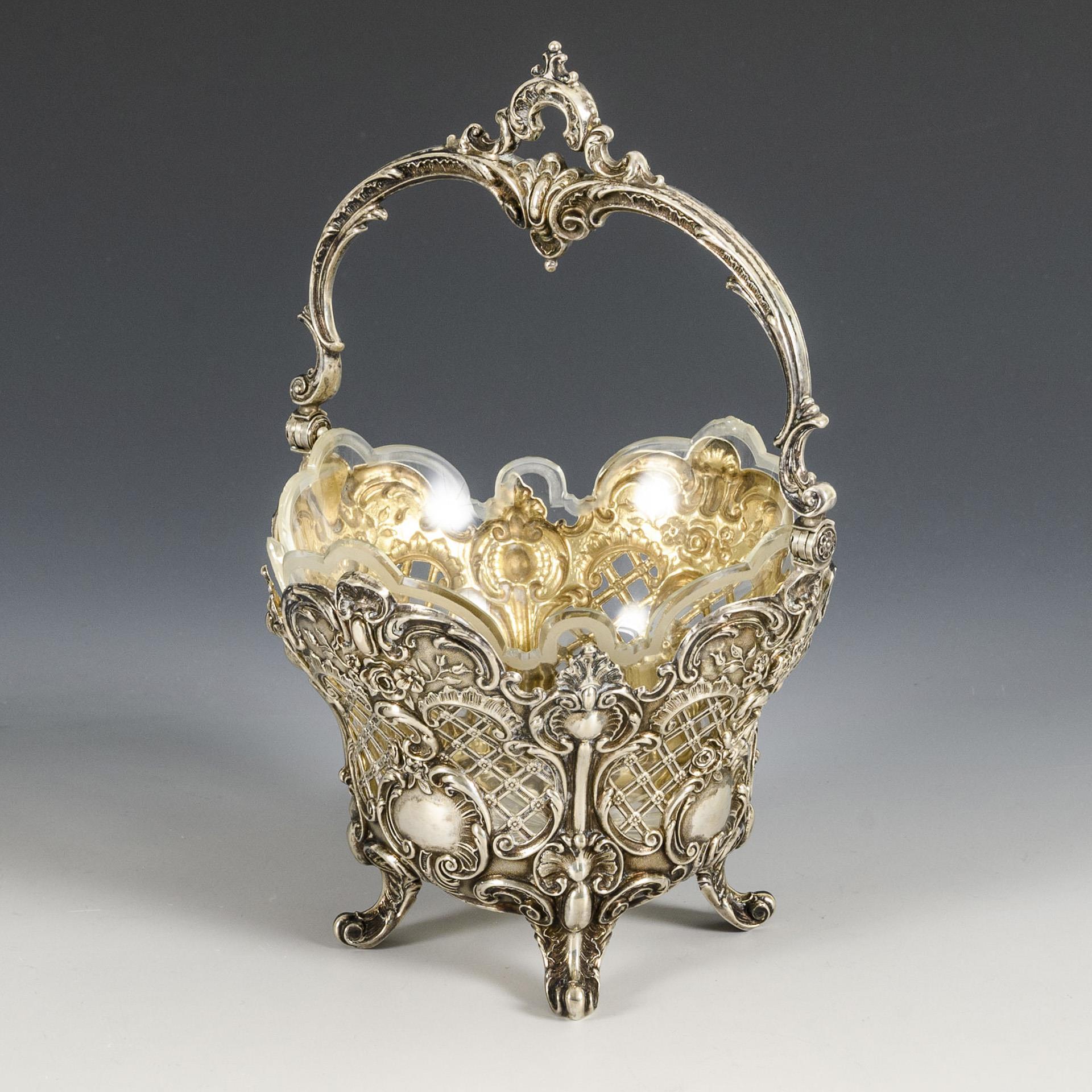 Rococo-style openwork basket with hinged handle (187 g). Glass insert with small chips to the rim.
