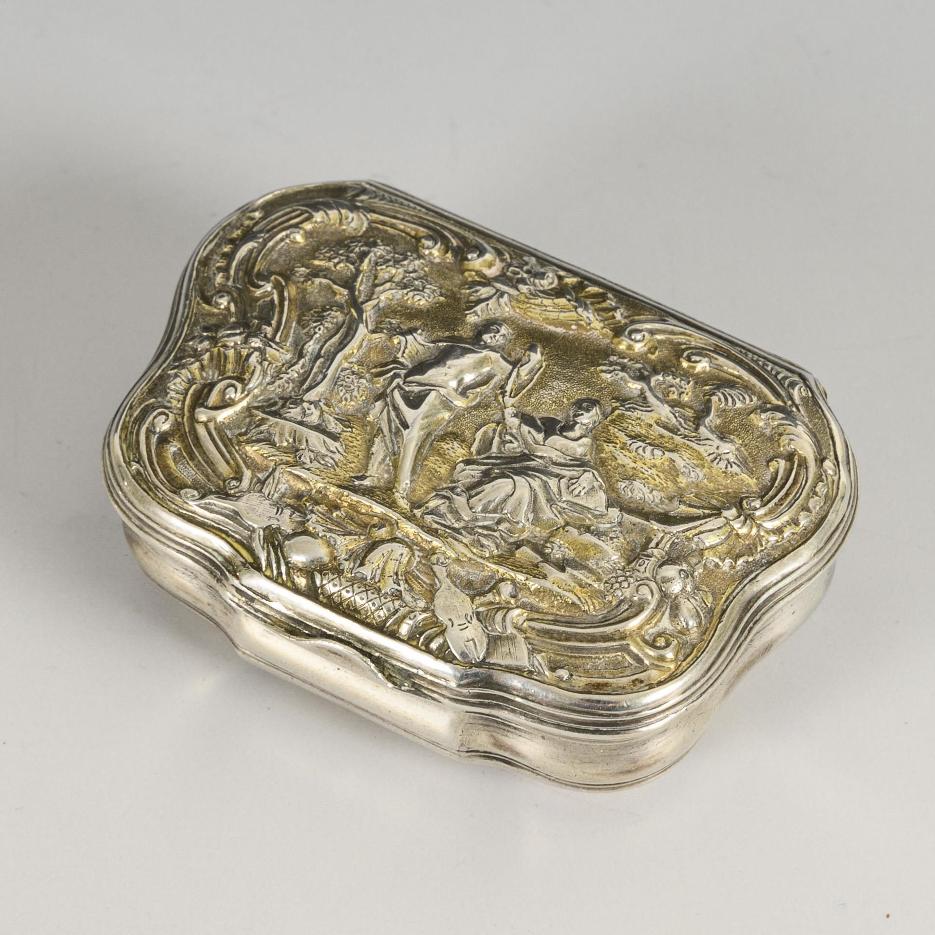 Small tabatiere with hinged lid in figural relief. Lid with plate inside, probably added later.