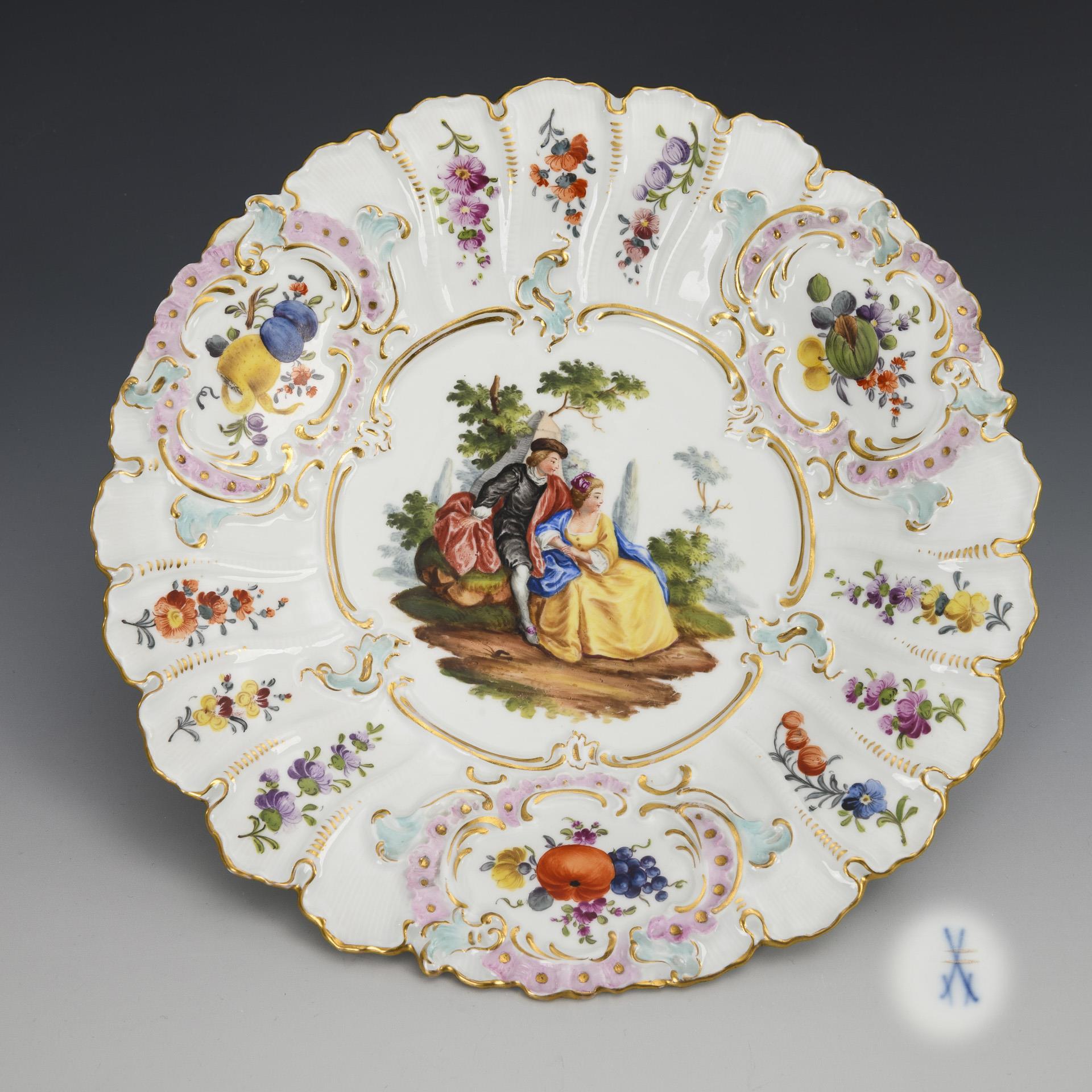 Rocaillerelief bowl with fruit painting in three rocaille cartouches, in the mirror the depiction of a gallant scene.
