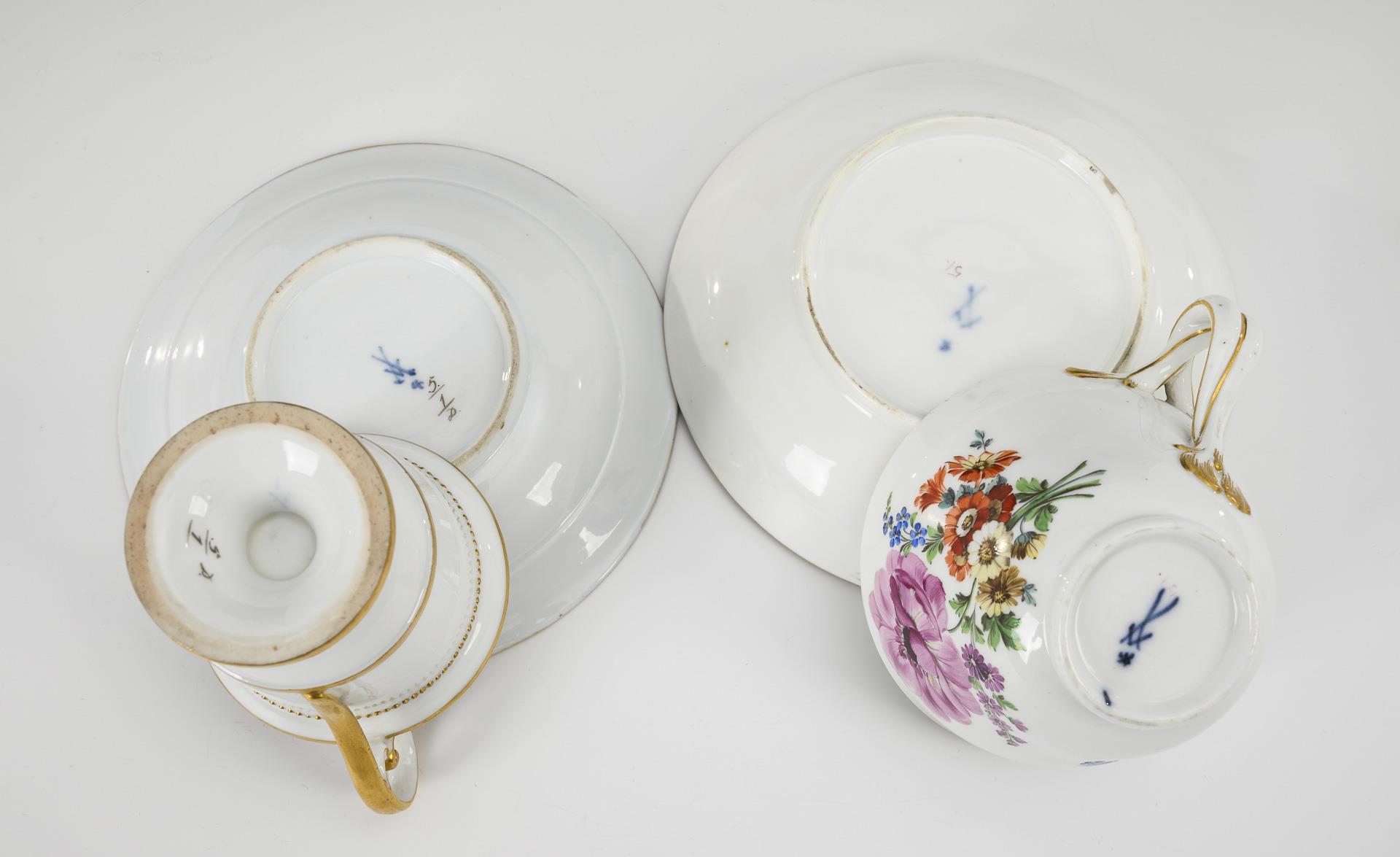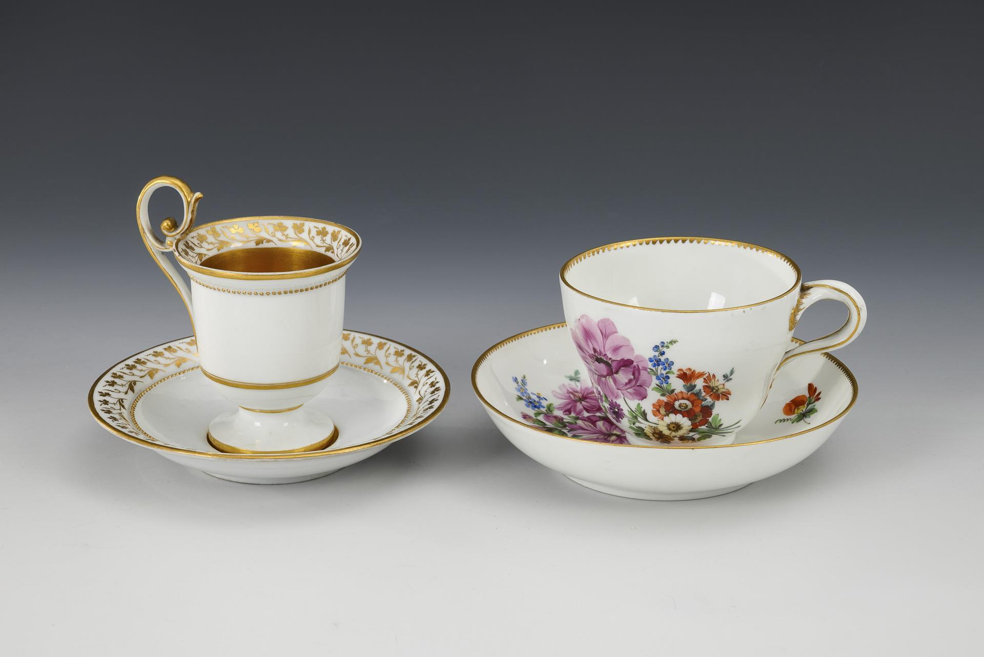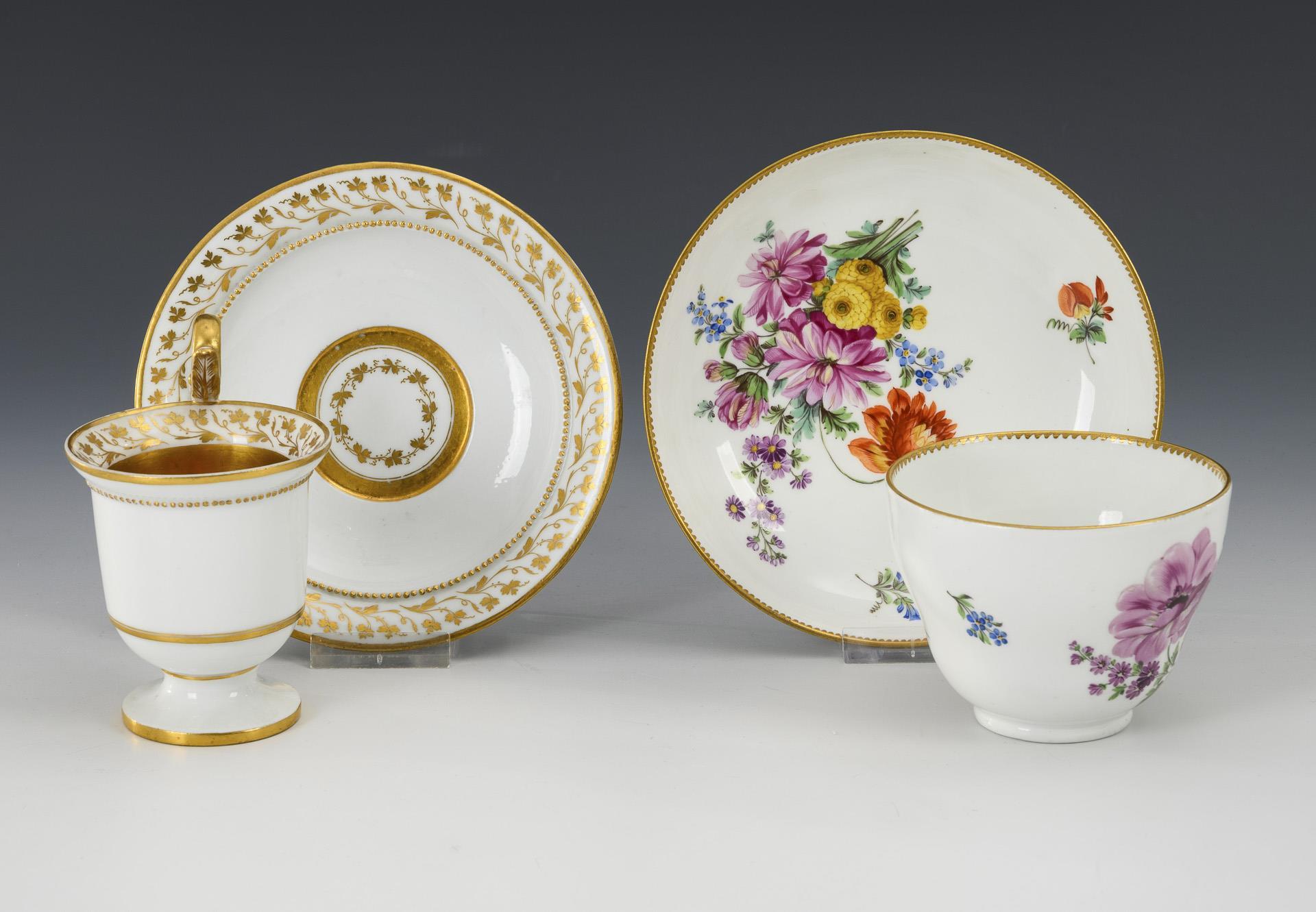 1x sword mark with star, Marcolini period, 1774-1814: large cup (h 7 cm) with curved handle and original saucer (Ø 15.5 cm). / 1x sword mark, 1st half 19th century: footed crater cup (h 11 cm) with pearl band, ear handle, original saucer (Ø 14.5 cm) and gold floral painting.