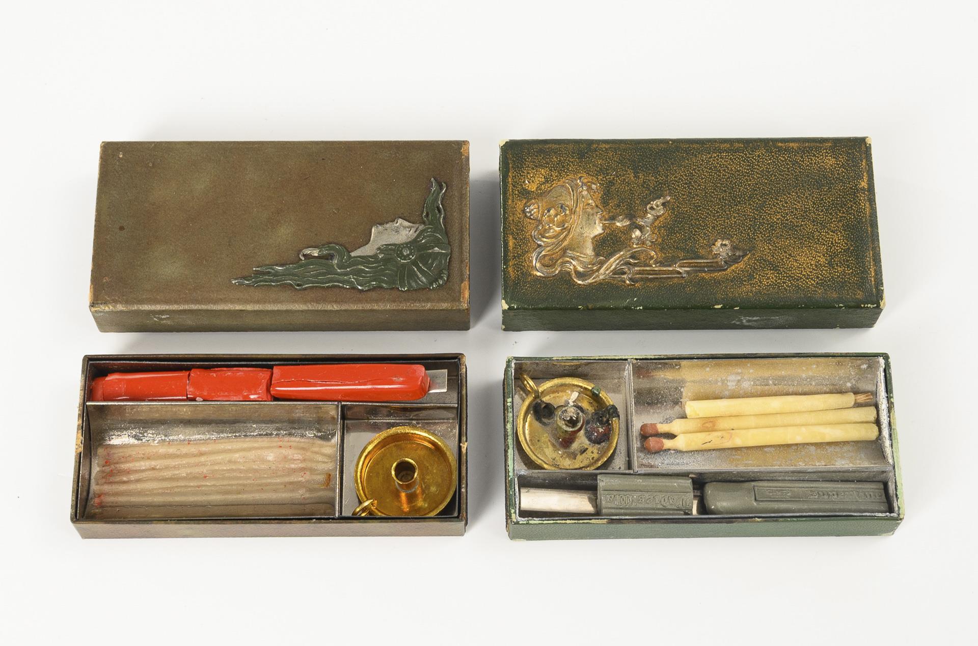 Tinplate with leather or calico cover and metal lids, brass candle holder, miniature candles and sealing wax. 4.5 x 9 x 1.5 cm.