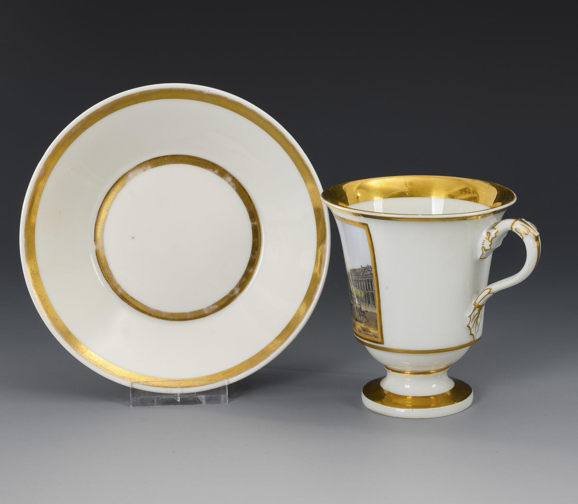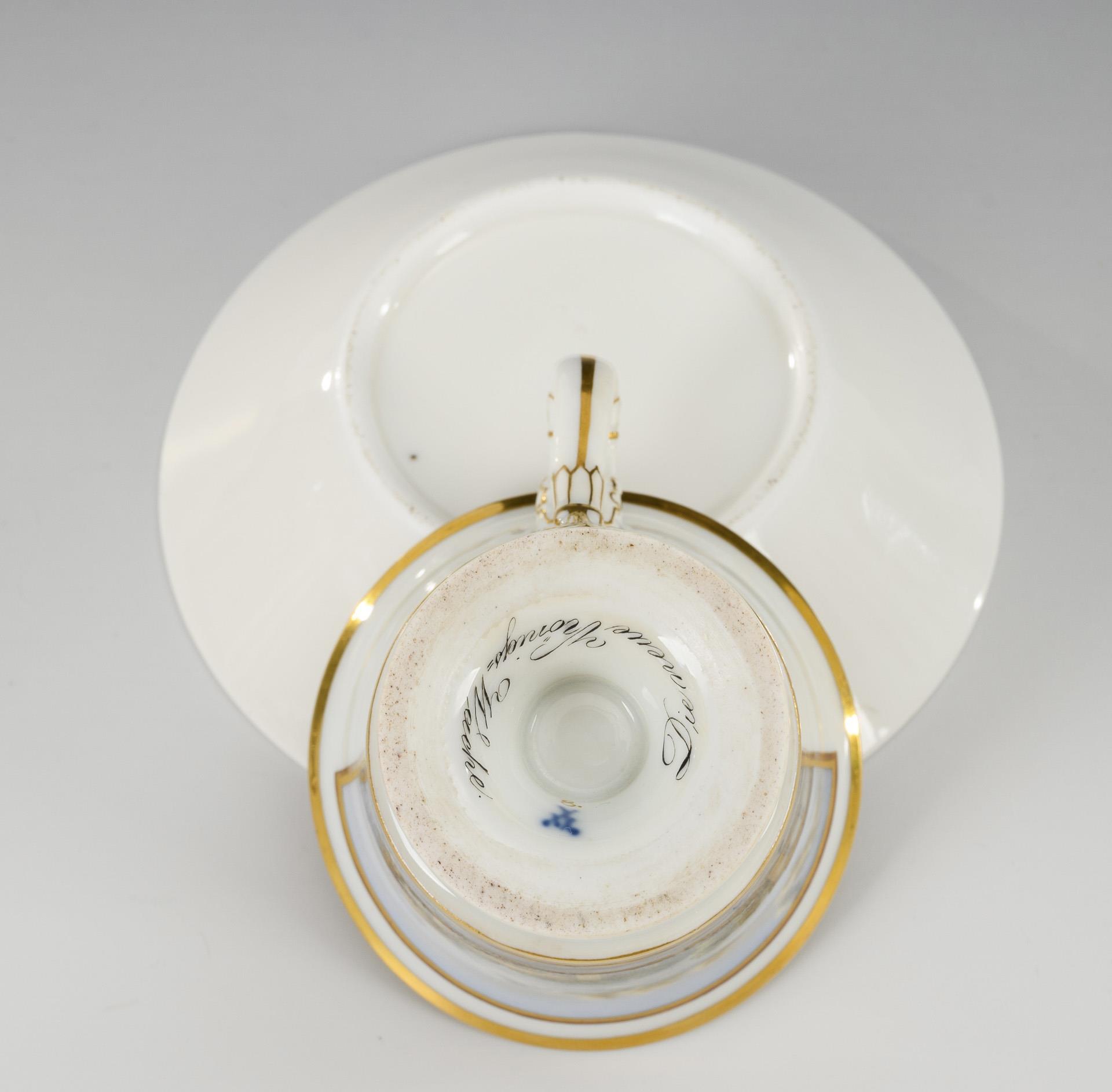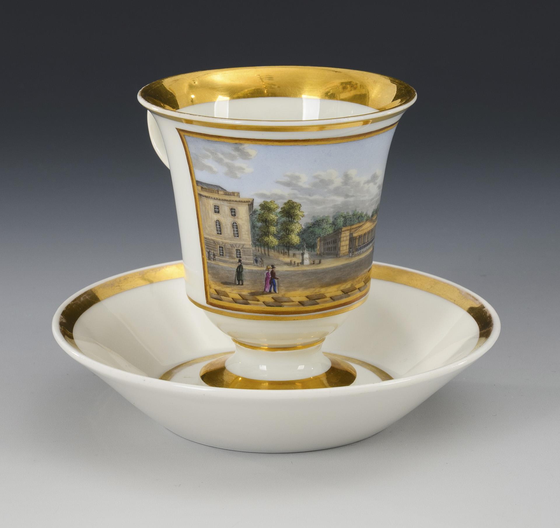 Footed crater cup with leaf handle. On the front a gold-framed rectangular cartouche with the view of the Neue Königswache in Berlin inscribed on the underside.