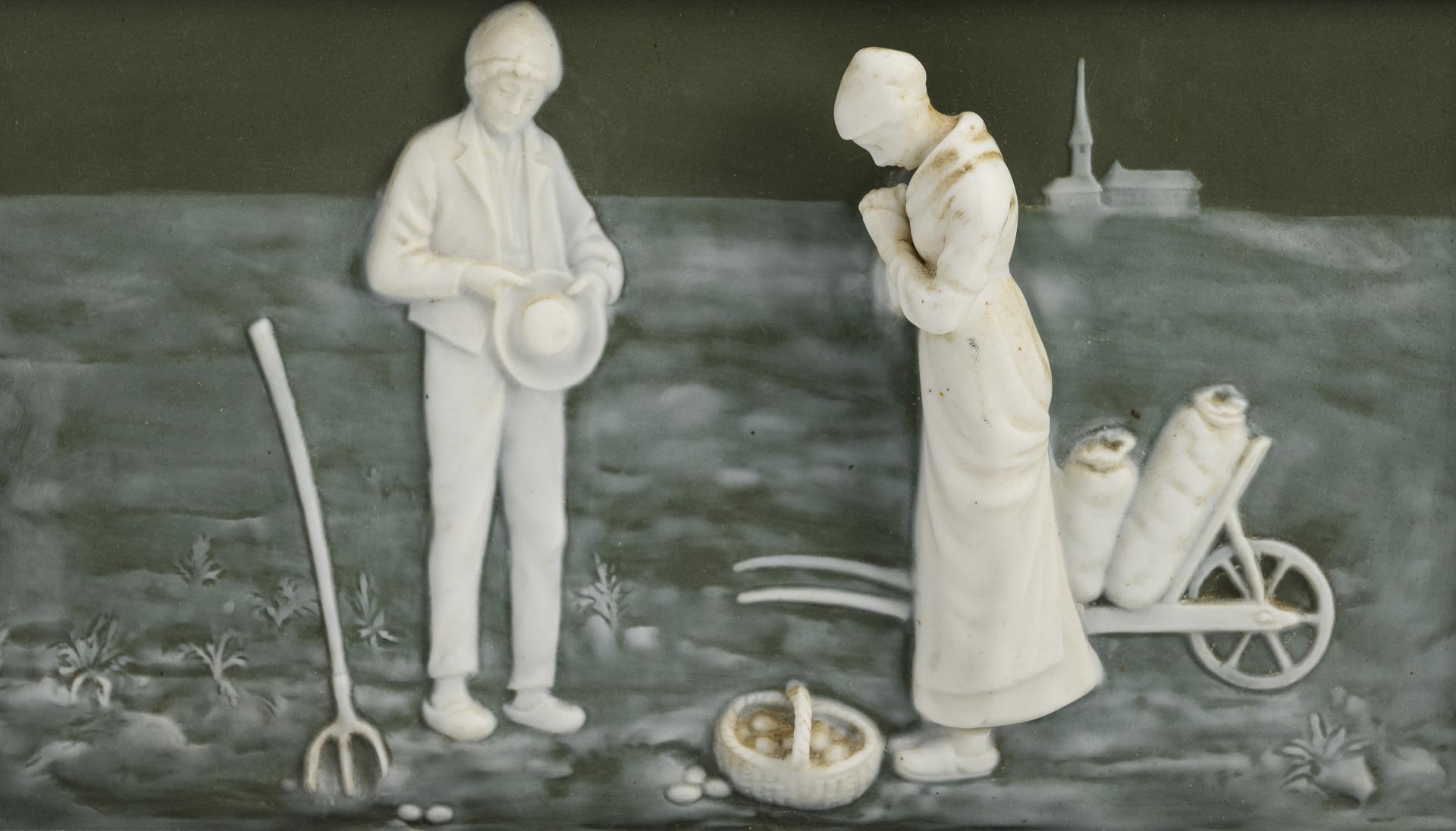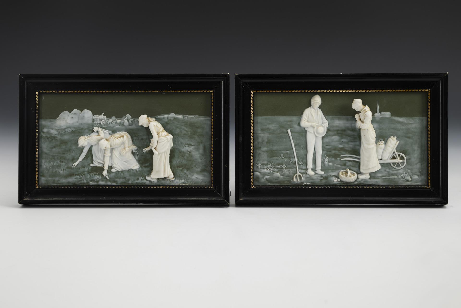 Rectangular plates made of porcelain colored olive green in the mass with figurative depictions in the pâte-sur-pâte style: 1x "Die Ährenleserinnen" and 1x "Das Angelusgebet" after Francois Millet (1814-1875). 1 bundle of ears bumped.