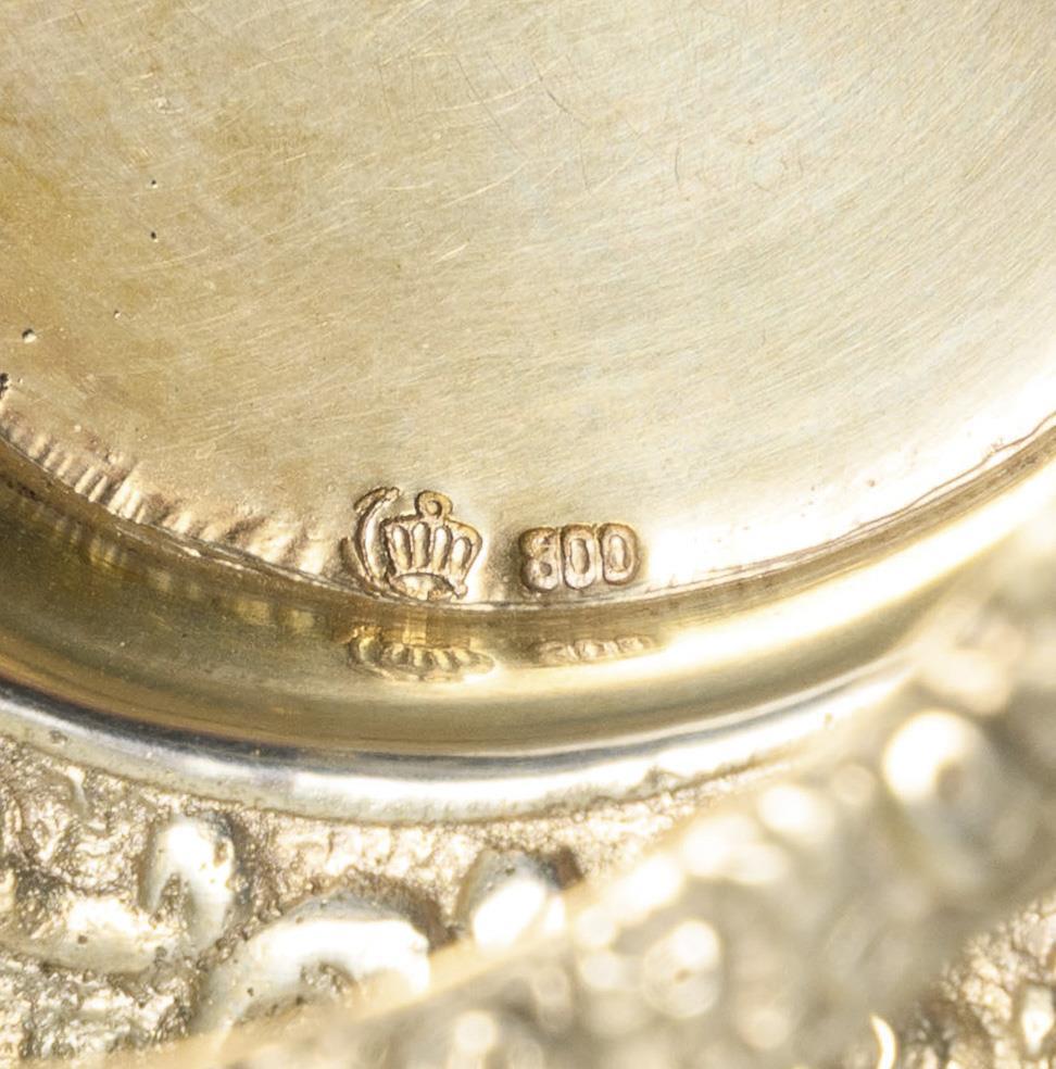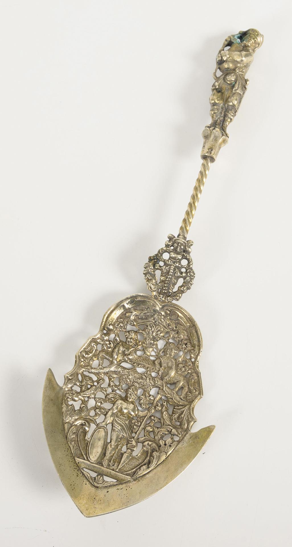 Richly reliefed lifter with figural handle (Netherlands, late 19th century, l 26.5 cm). / 2-piece tea strainer in floral relief (crescent/crown/800 hallmarked, h 5 cm). / Oval salver with defective, blue glass insert (half-moon/crown/800 hallmarked, 2 x 6 x 3.5 cm). Signs of wear, small defects.