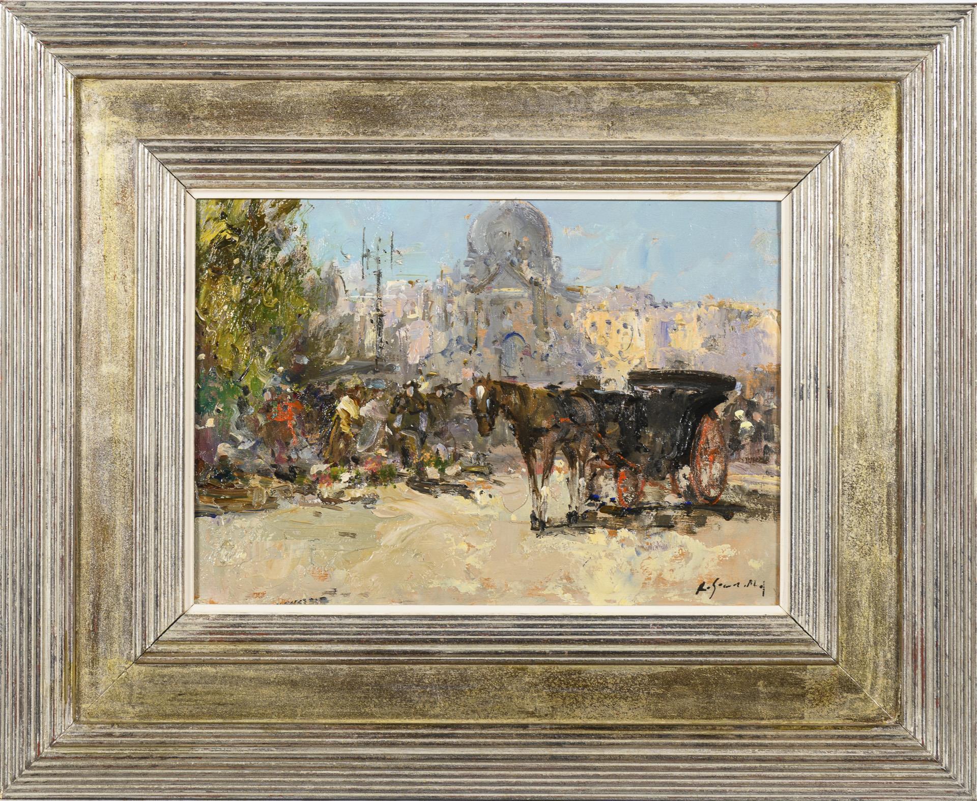 Impressionist market scene with carriage and people in the sunshine in front of a domed building.