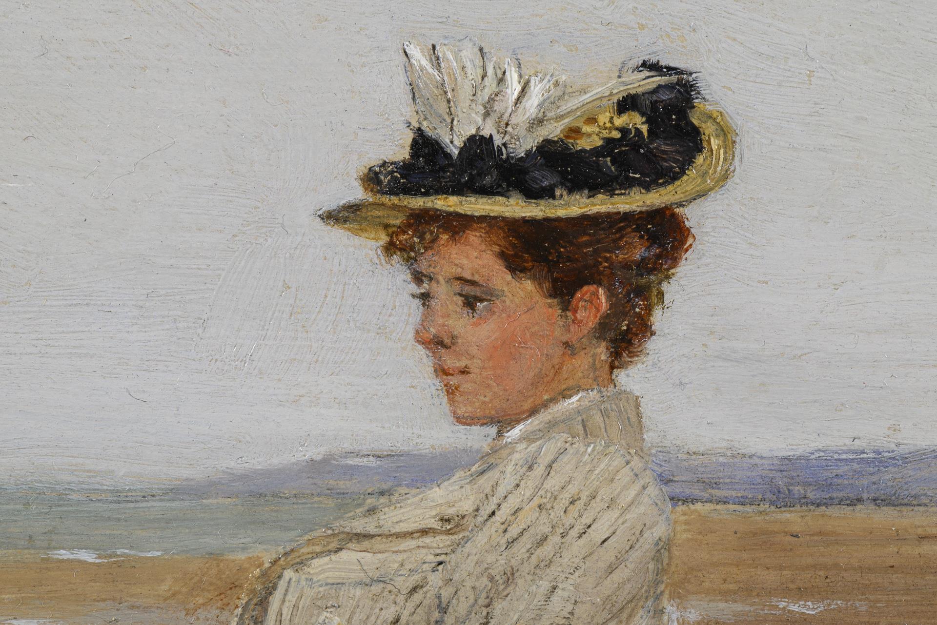 Young woman in lilac dress with hat on a chair with view to the sea. Retouched.