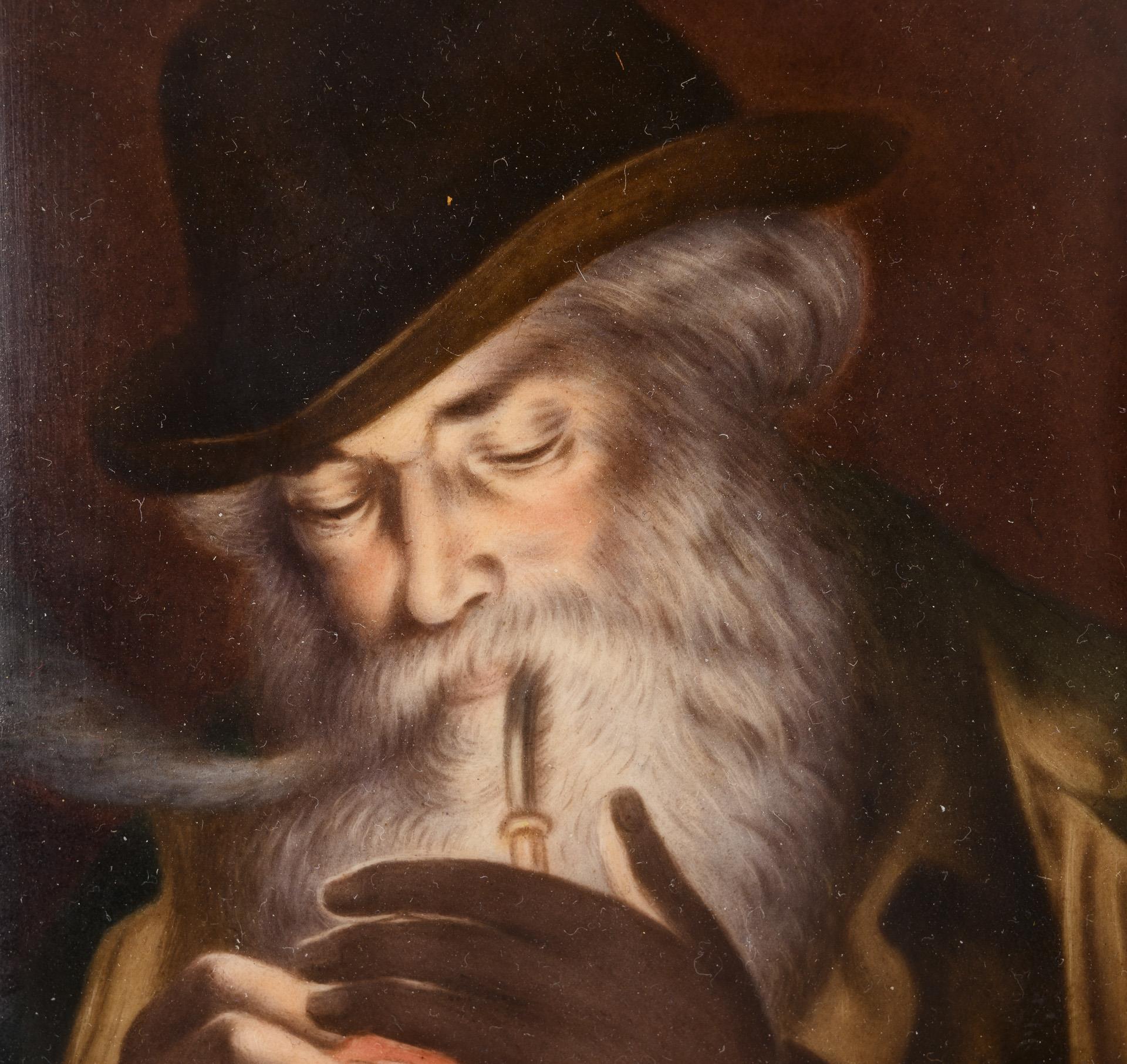 Rectangular panel with the depiction of a bearded old man lighting a pipe, after a painting by Georg Hom (1838-1911).