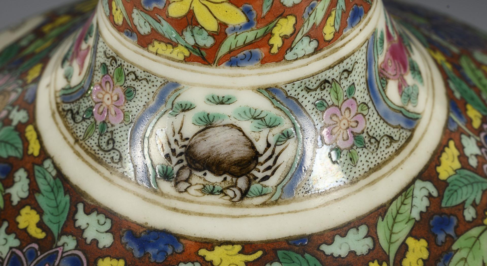 High-quality baluster vase with figurative cartouches between fine floral ornament. 'Spider' on the base, upper rim shortened and ground, old chip on the base rim.
