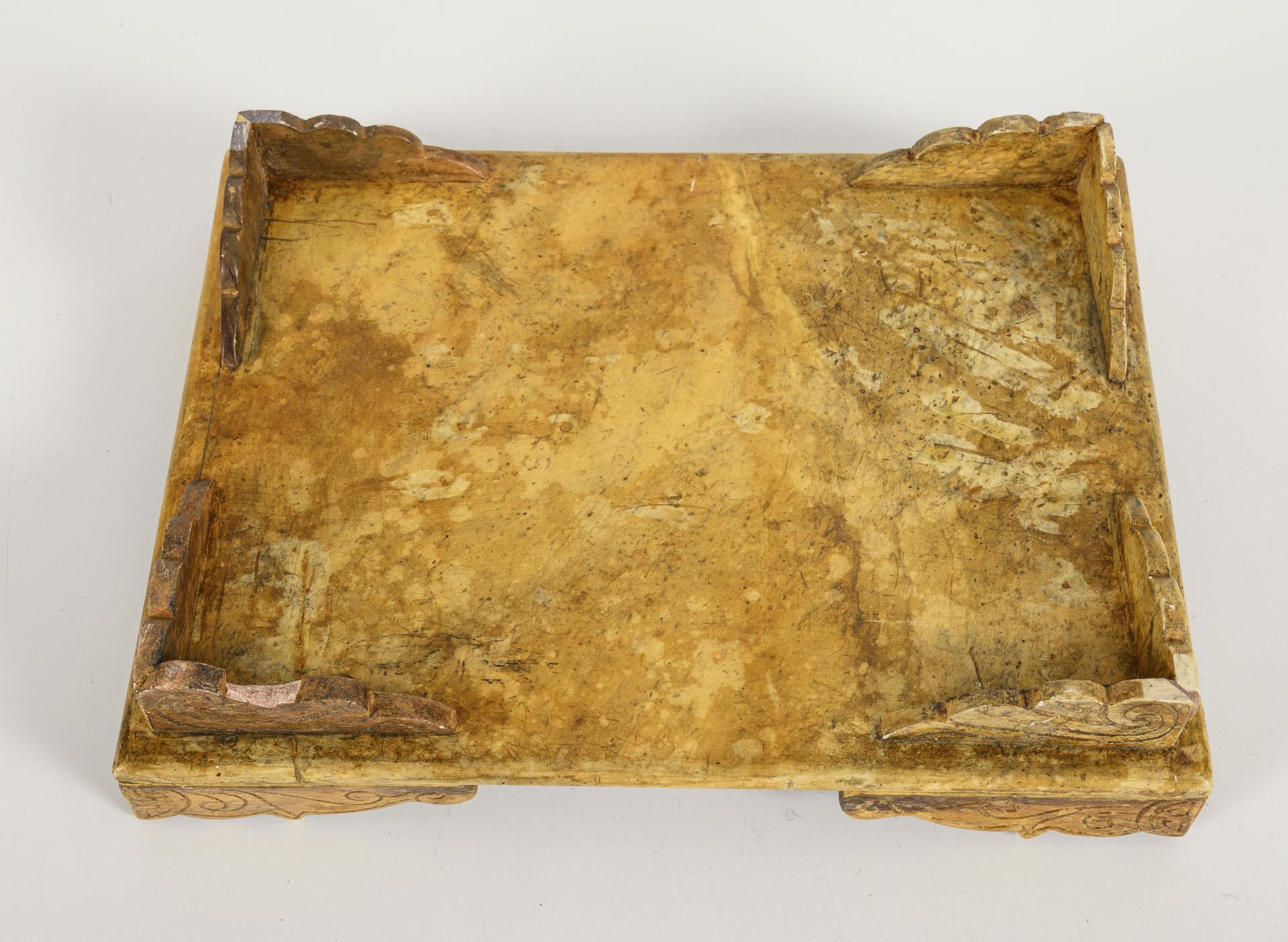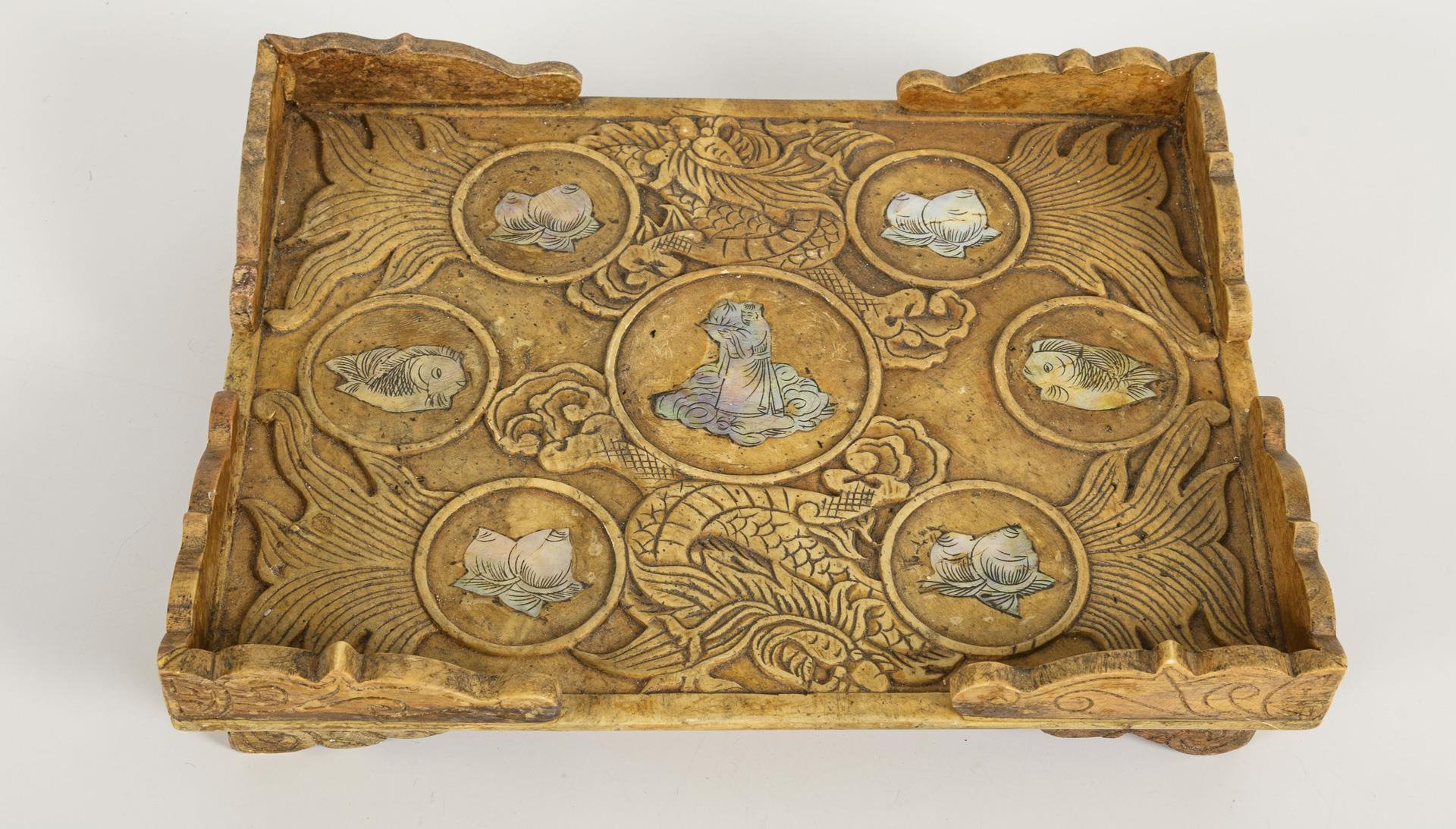Artfully crafted tray with bas-relief and mother-of-pearl inlays. Comes with four marked mugs with dragon motif. One mug with chip.