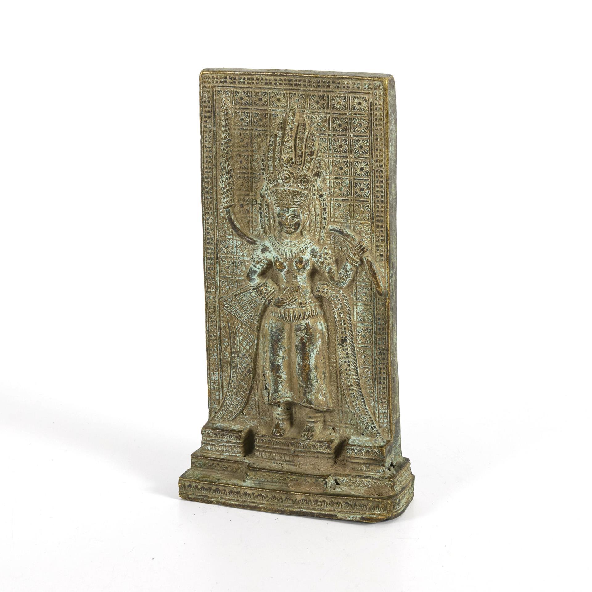 Apsara with a flower stalk in her hand. Standing on an implied pedestal. Relief hollow inside, back smooth.