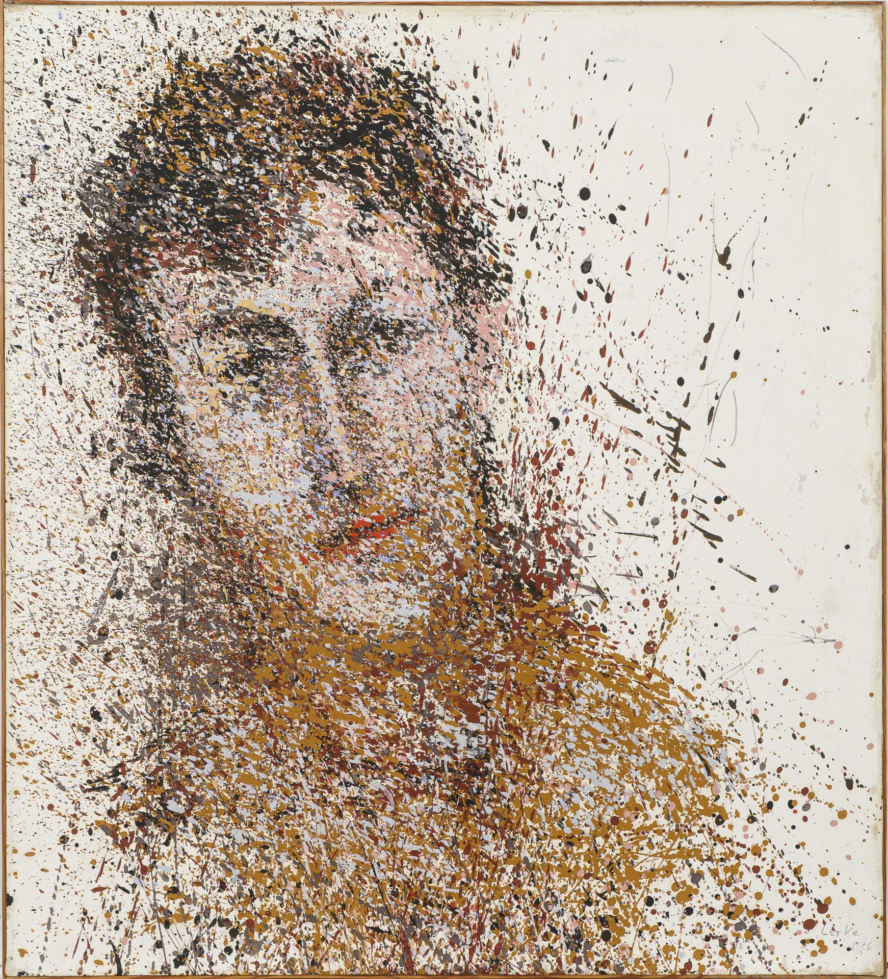 Self-portrait of the artist in her unmistakable splashy style. Slight traces of age.