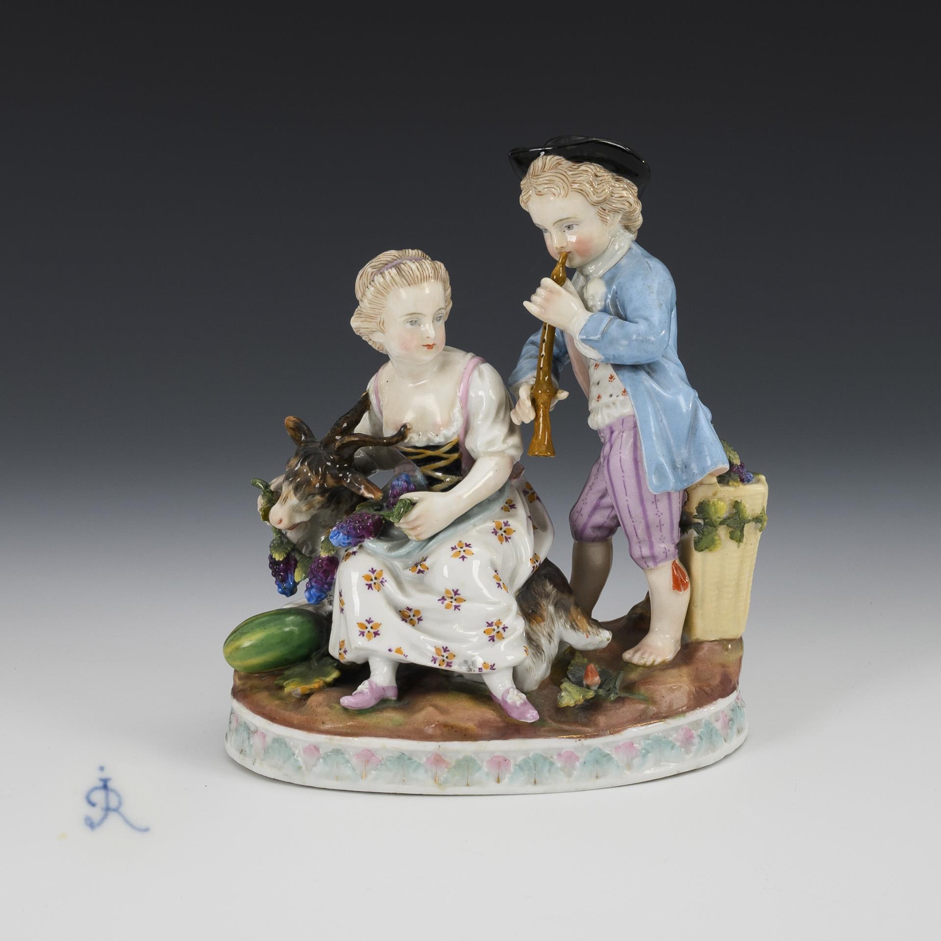 Couple of children with billy goats and a wine pannier. Gold rubbed, the boy's flute and hat, the girl's right hand, goat's head and some of the leaves restored.