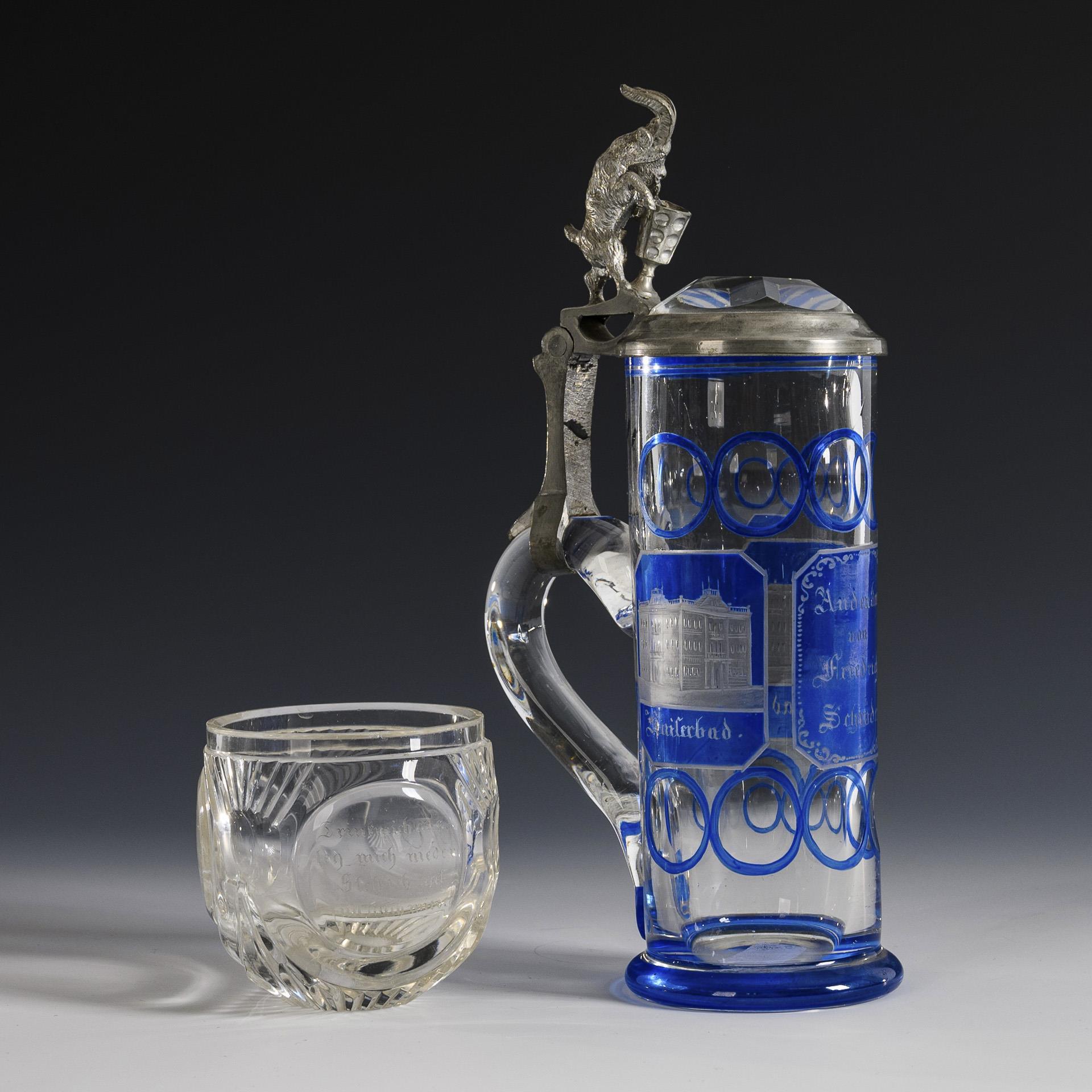 1x small cylindrical jug made of colorless, blue-glazed glass with pewter-framed glass lid and a billy goat as handle; with lentil cut and two engraved views of Teplice (h 23 cm). / 1x colorless glass ball mug with notch and lentil cut, with the saying "Trink mich aus / legen mich nieder / Steh ich auf / füll mich wieder" (H 7 cm). Small knocks to the rim of the mug.