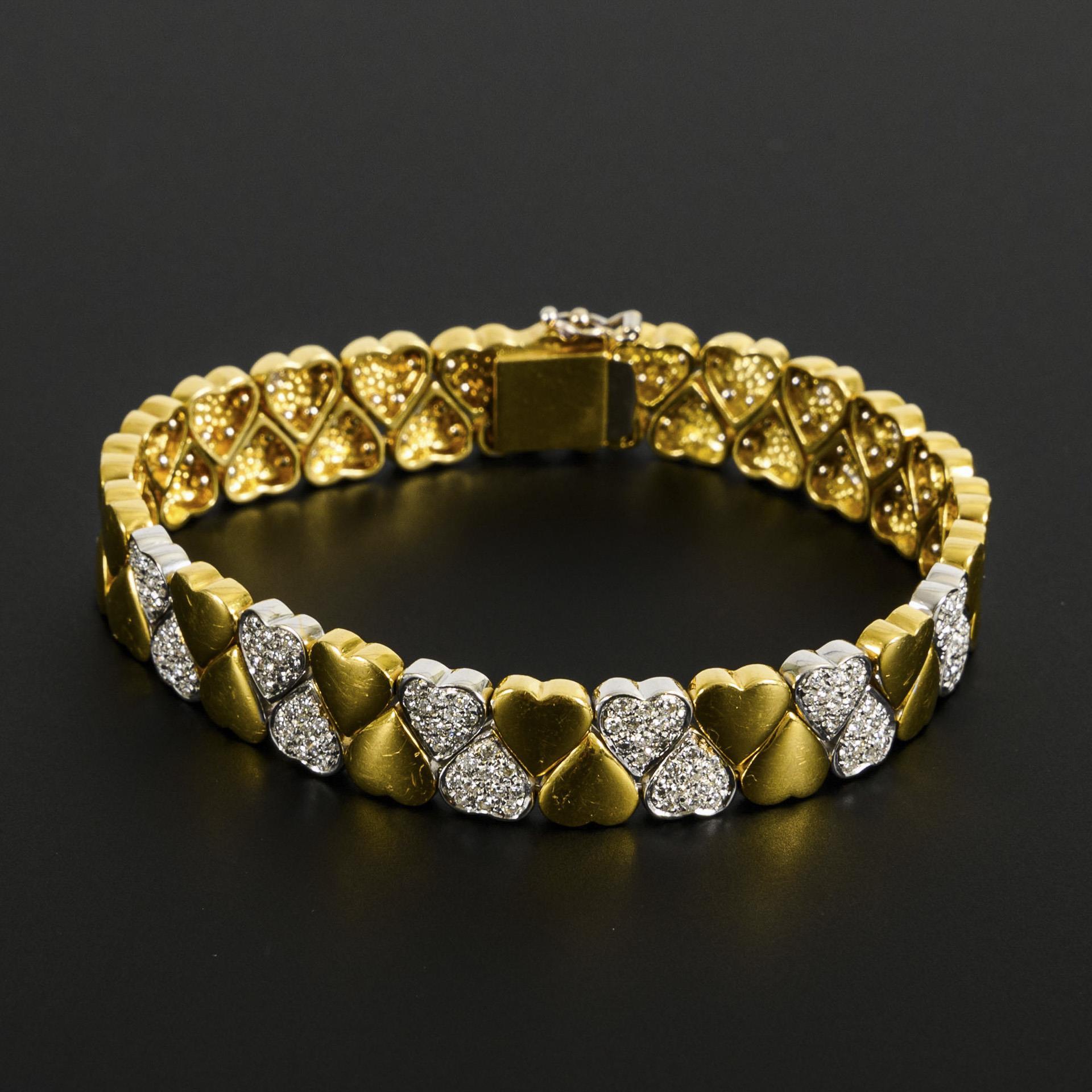 High-quality bicolor bracelet with double-row links in heart shape, 12 of these in white gold set with pavé-set, small diamonds. Ca. three small diamonds missing, the yellow gold with traces of wear.