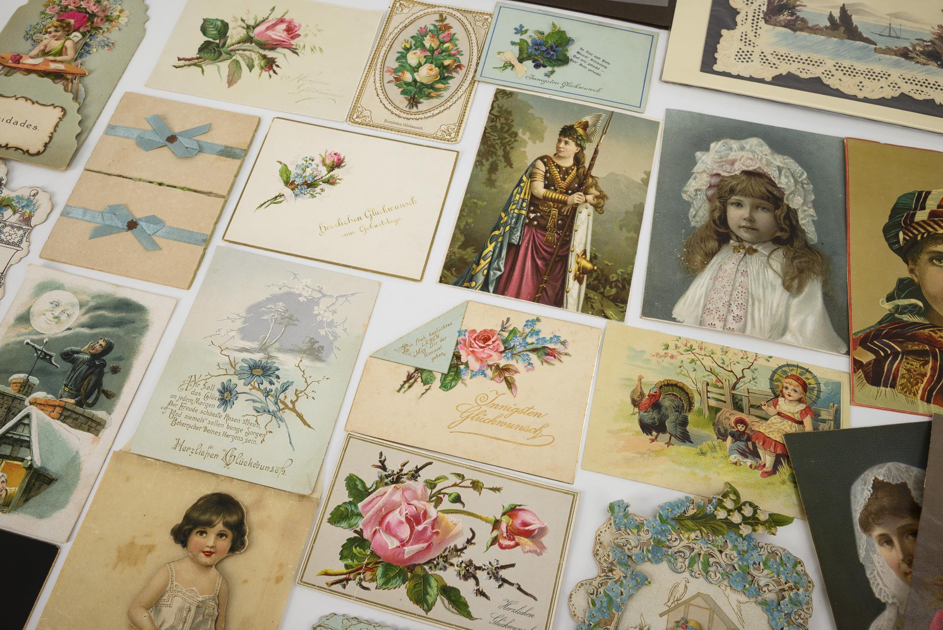 Partly quite large color lithographs (mostly girls, 1x with advertisement for chicory coffee by Bériot, Lille), several backdrop displays, some wafers, 4 watercolors, 1x of which with natural materials (landscapes/coasts) mostly in embossed paper frames, 2 sand paintings (landscapes) in embossed paper frames, 1 ink drawing in the manner of silhouettes, 2 embossed English obituaries (1878 and 1879). In box with partly embossed leatherette. Some signs of age/use, some minor losses.