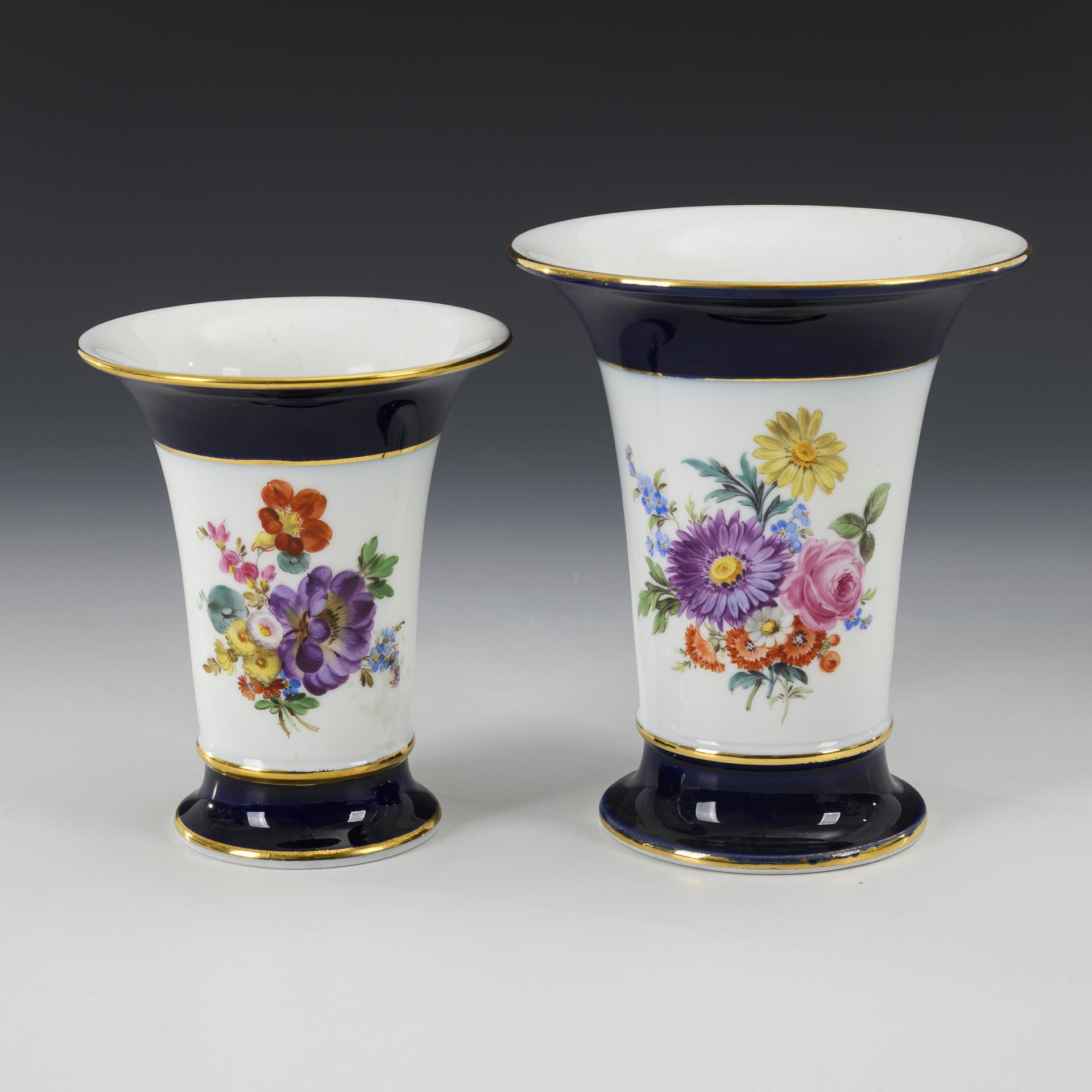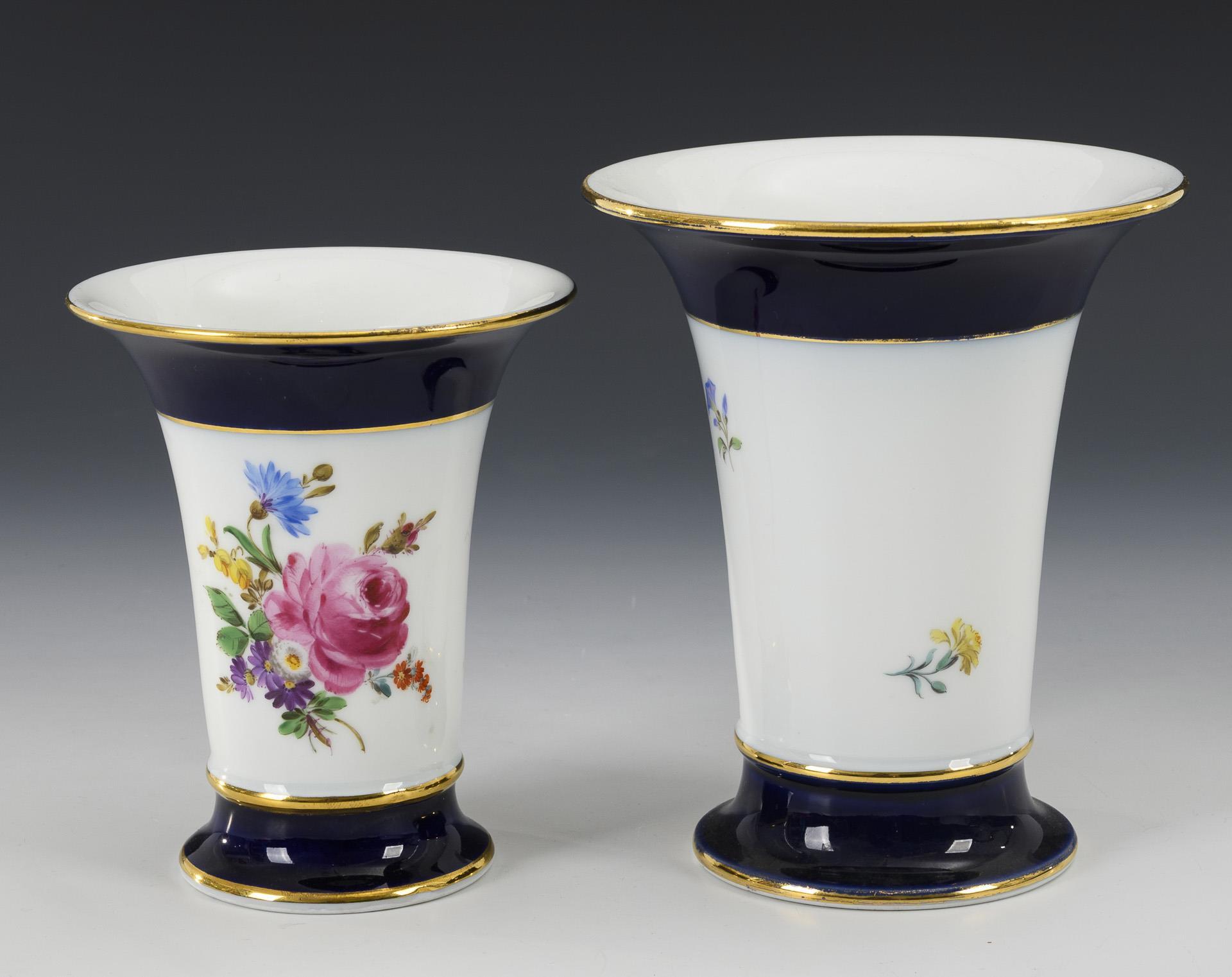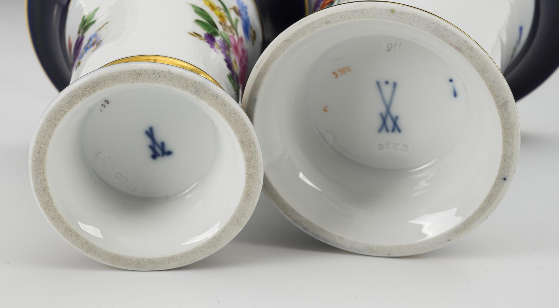 Cobalt blue partial ground, polychrome flower painting, gold staffage. H 14 and 16.5 cm.