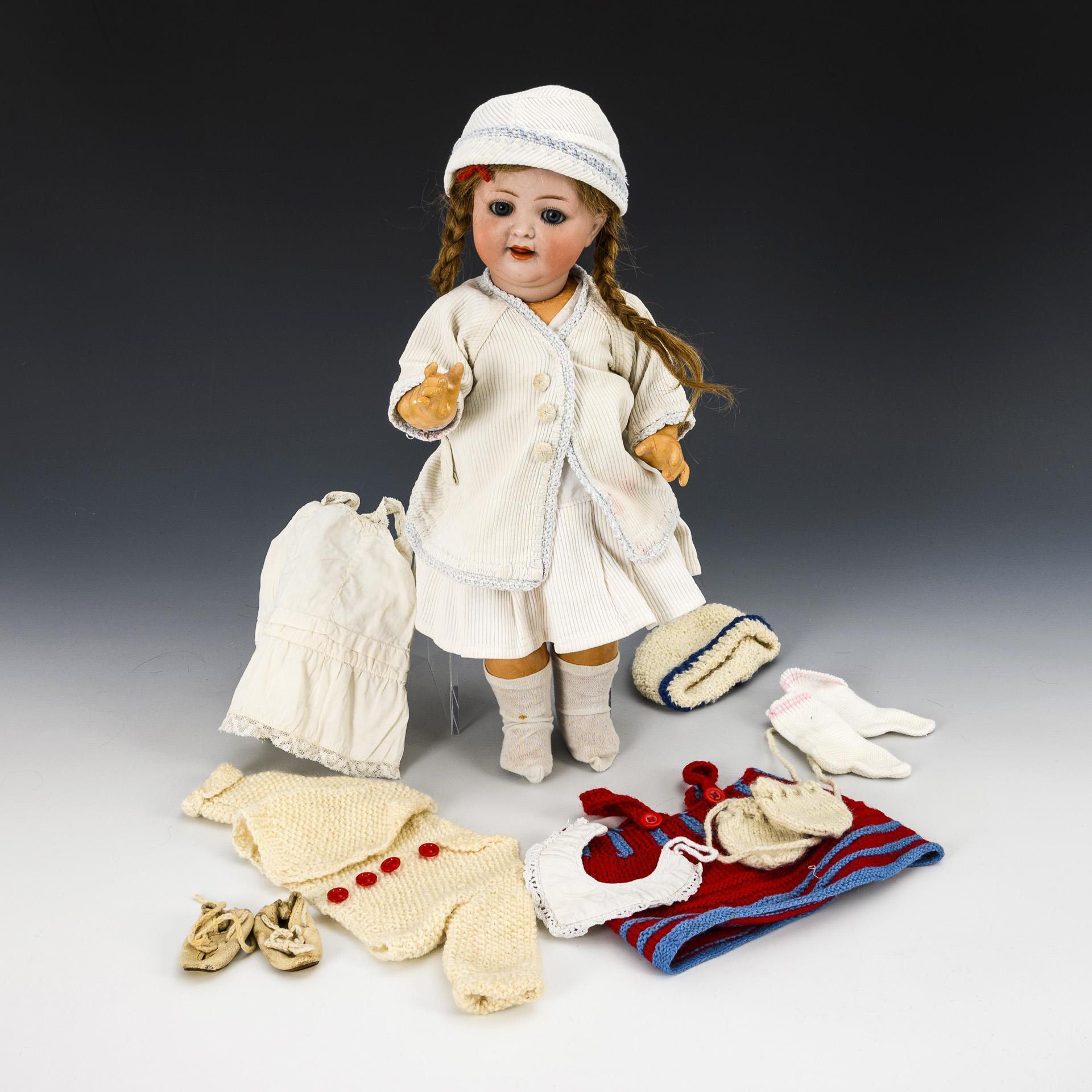 Hans (head mark: FS & Co 1272/40 Deposited) with crank head, blue sleeping eyes, open nostrils, molded tongue, blond mohair bead and 5-part sitting baby body (L 40 cm). / Grete (head mark: K & R / S & H 126, with "W" on the forehead) with crank head, blue sleeping eyes, movable tongue, dark blond real hair wig with pigtails and 5-part standing doll's body (length 38 cm). Both with white cotton clothes and additional clothing (partly 1950s). Knees illuminated: Head of the girl without defects, boy with chips on the neck crank and lower lip, 1 eye slightly lower.