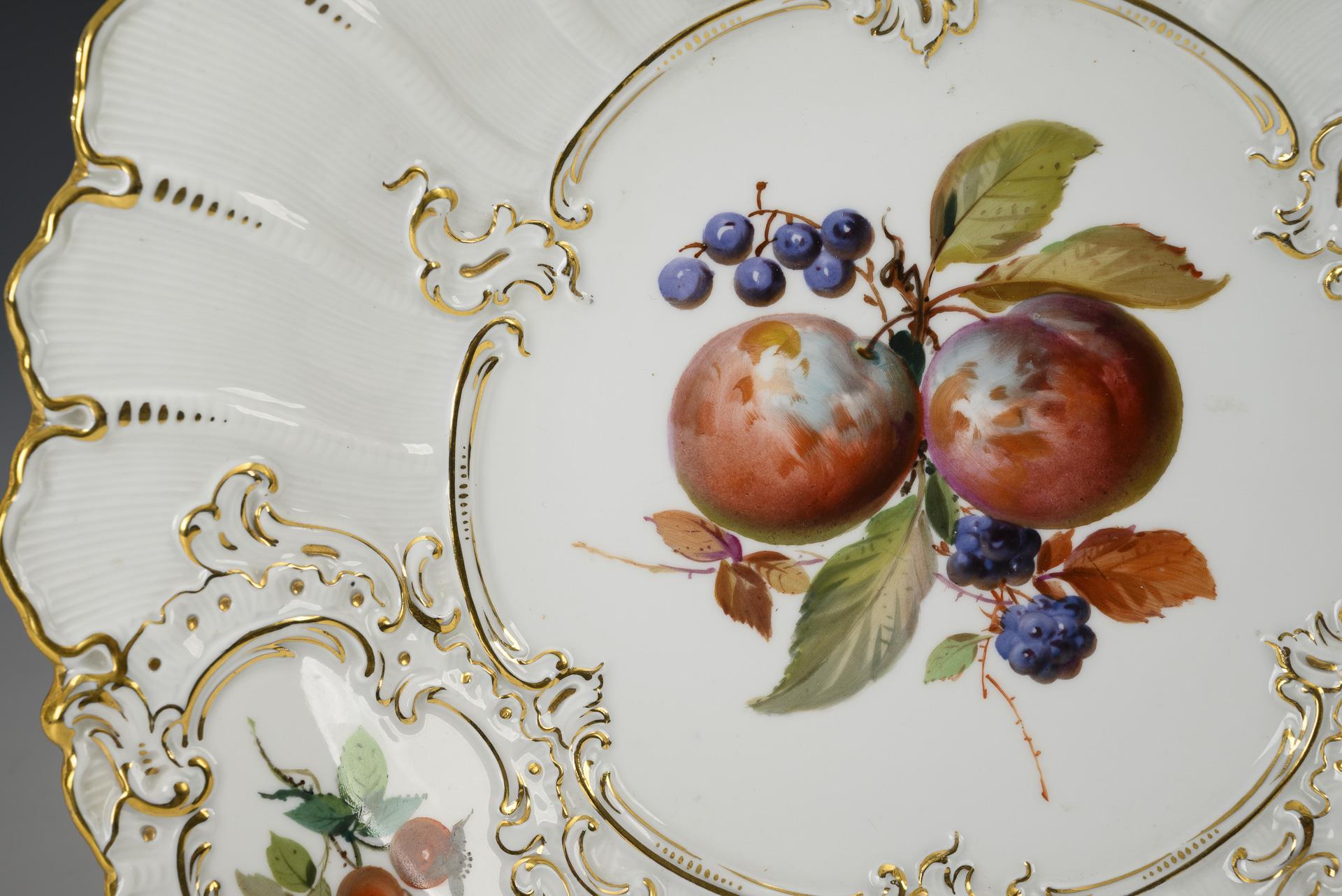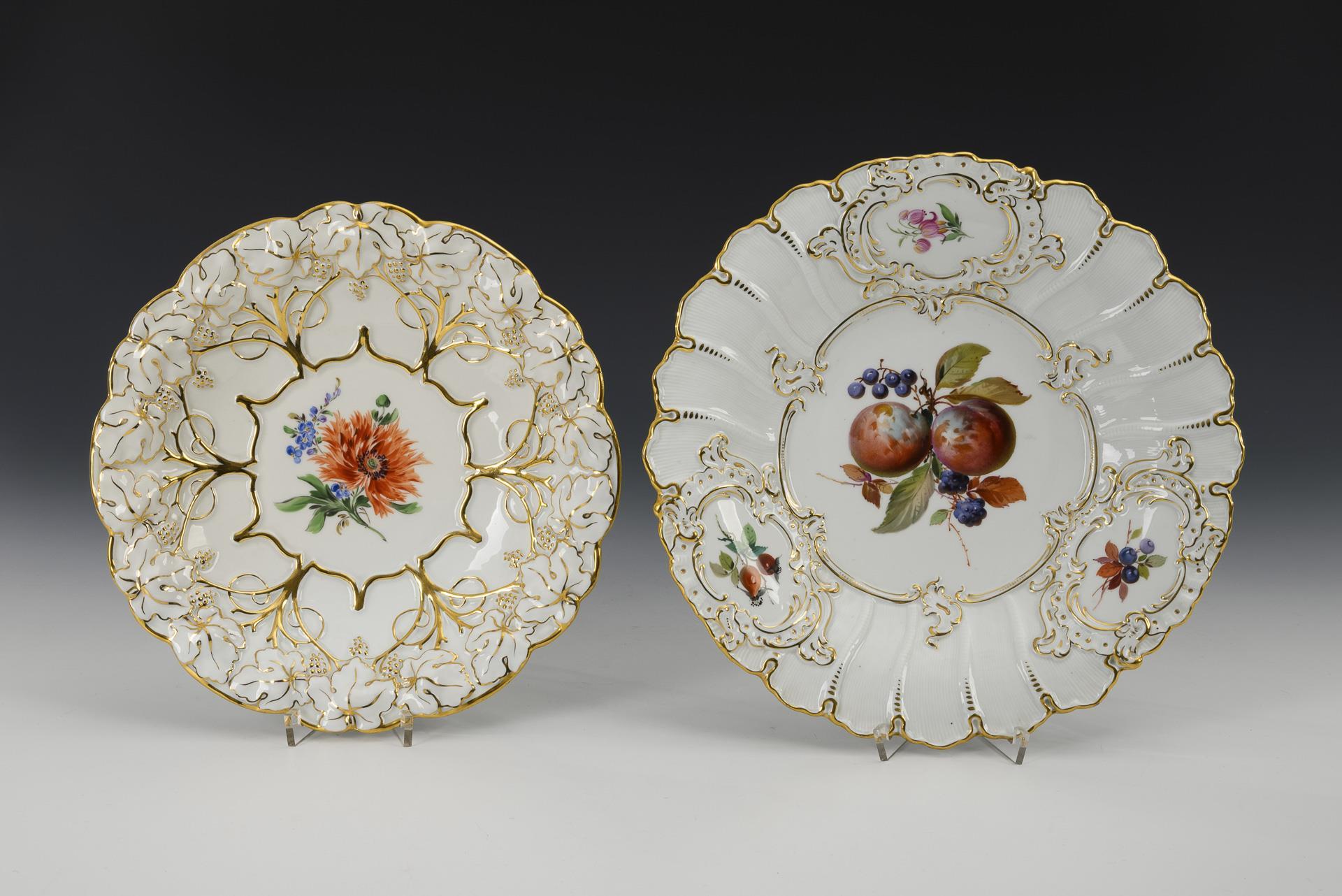1x bowl with shell-relief flag, three rocaille shields and fruit painting / 1x bowl with vine relief and flower painting.
