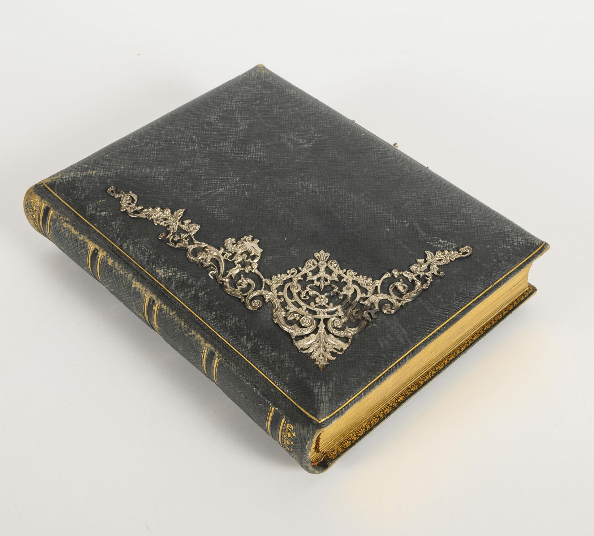 82 photographs of children, including 72 CDV (Carte de Visite) studio photographs, some with toys. Leather binding with metal application, clasp missing.