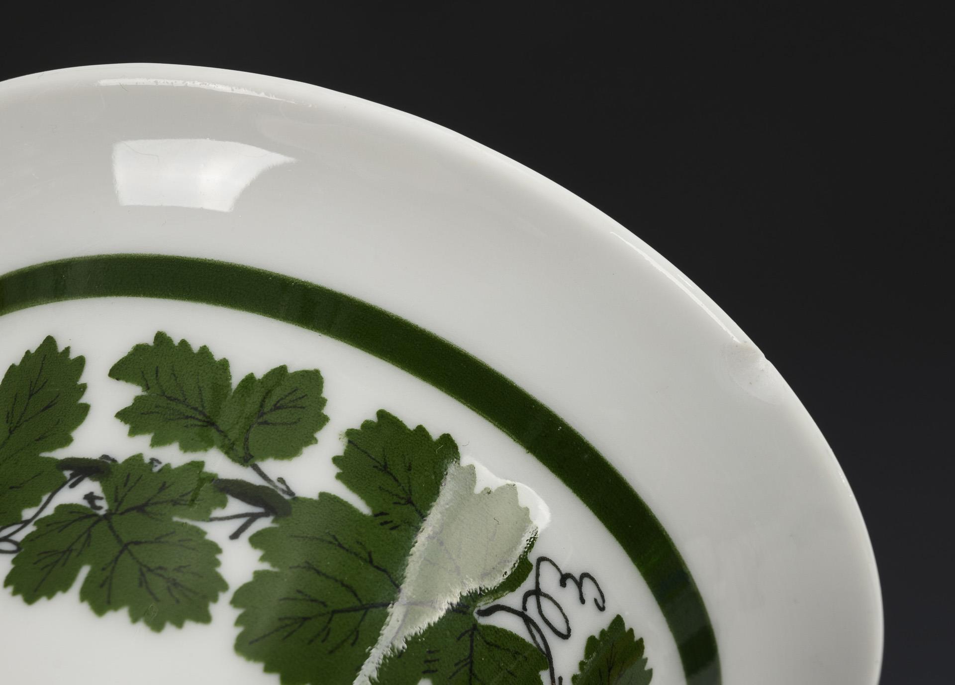 3x vine leaves: flute vase (H 24.5 cm), krater vase (H 13.5 cm), demitasse cup (H 5 cm) with original saucer (Ø 11.5 cm). / 1x footed bell cup (H 12 cm) with lion's head handle and original saucer (Ø 16 cm): the gold-stamped bisque relief portrait of Johann Friedrich Böttger (1682-1719). Bump to the rim of the crater vase.