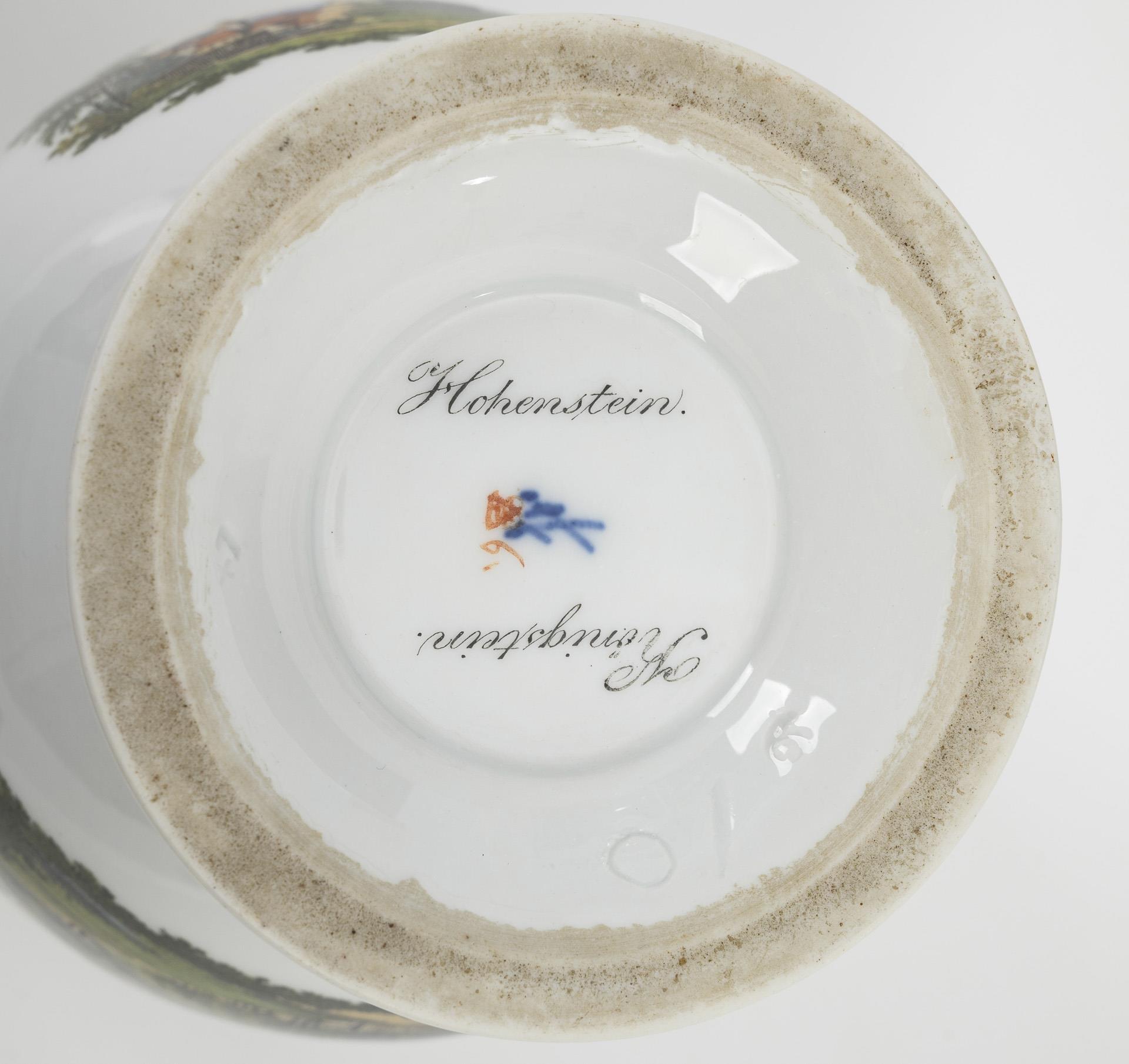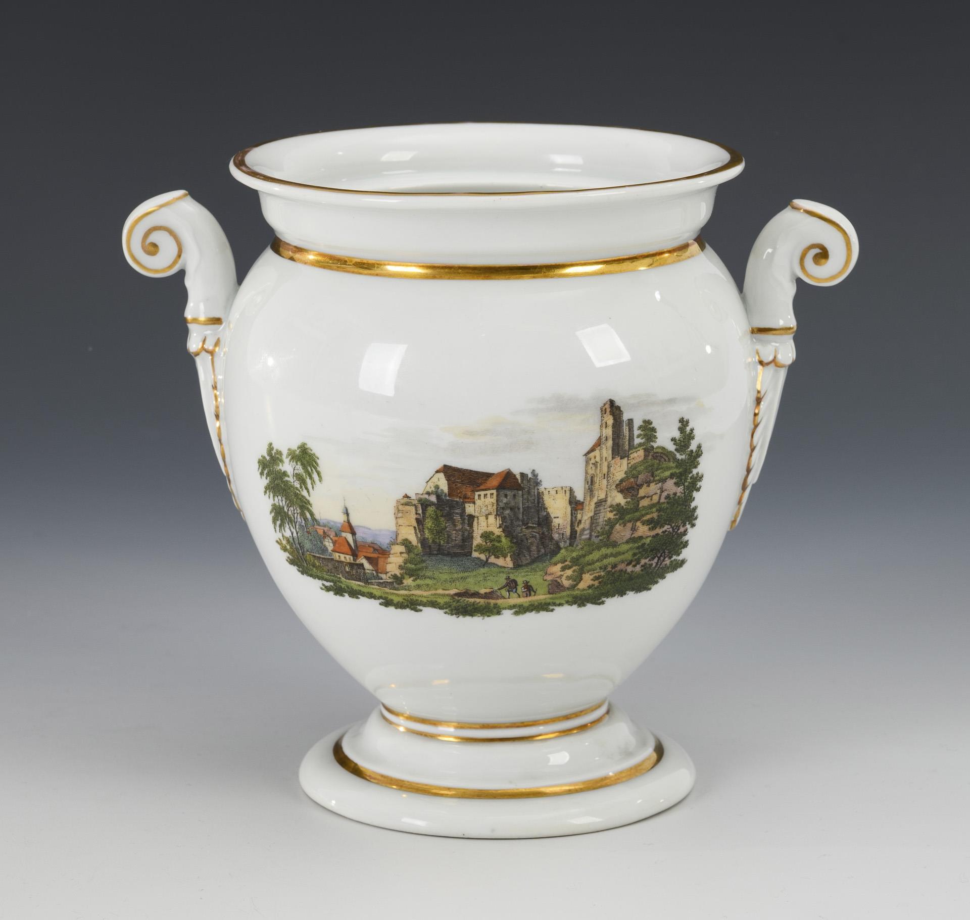 Ovoid body with two volute handles and round base. On the wall a view of Königstein Fortress and a view of Hohnstein Castle in Saxon Switzerland. Without lid.