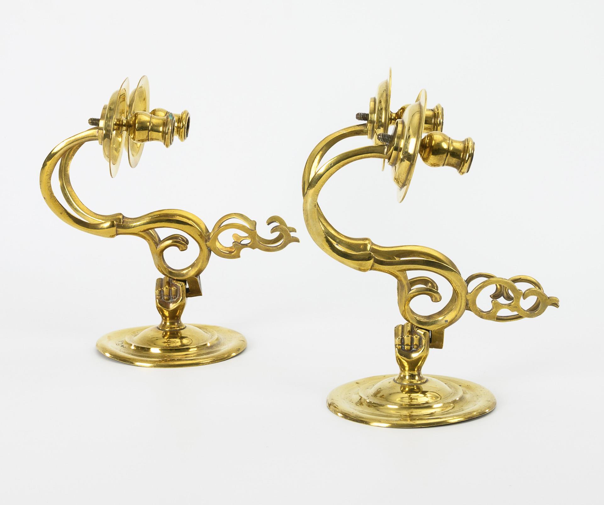 Bronze chandelier with round wall mount and fist for the inserted volute arms with vase nozzles and drip trays. 1 arm crowning soldered, otherwise hardly any signs of age/use.