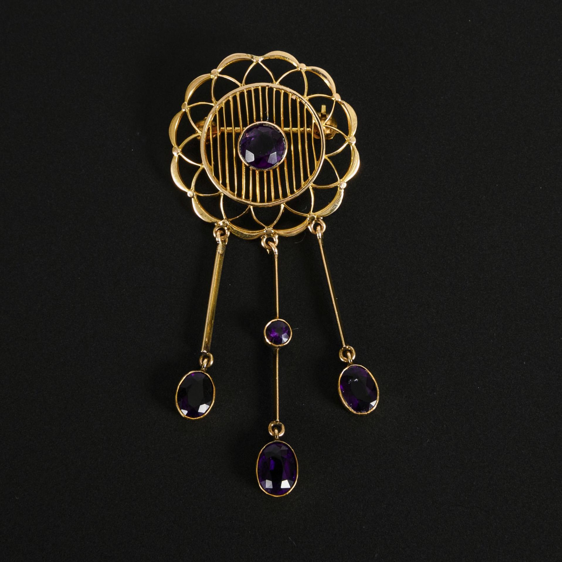 Stylized flower brooch with bezel-set amethyst and 3 amethyst-studded bar pendants. Ball hook.