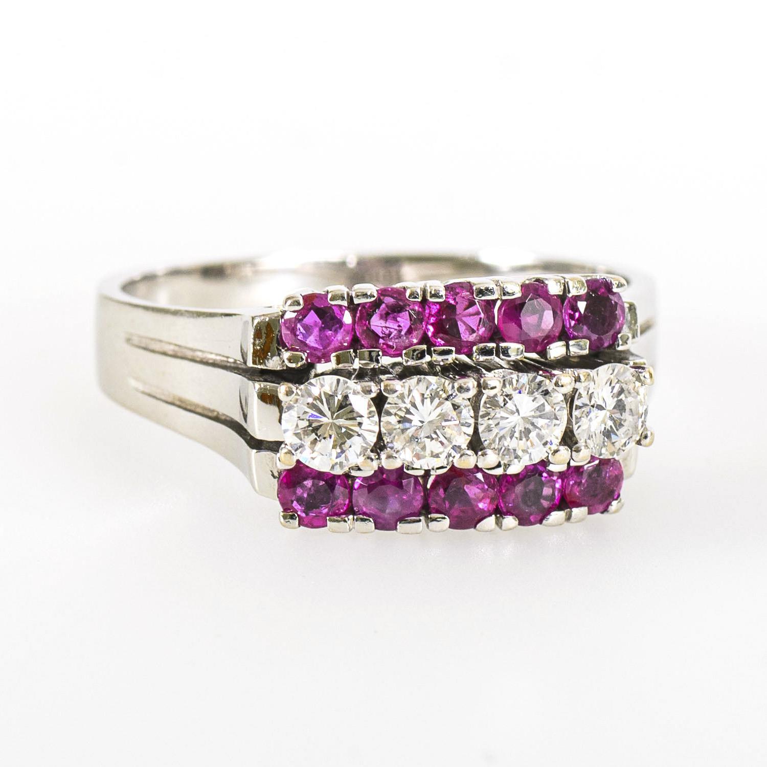 Stamped white gold 585; the rubies together approx. 0.60 ct; the diamonds together approx. 0.65 ct, of high color and purity. Ring size 60. 6.2 g.
