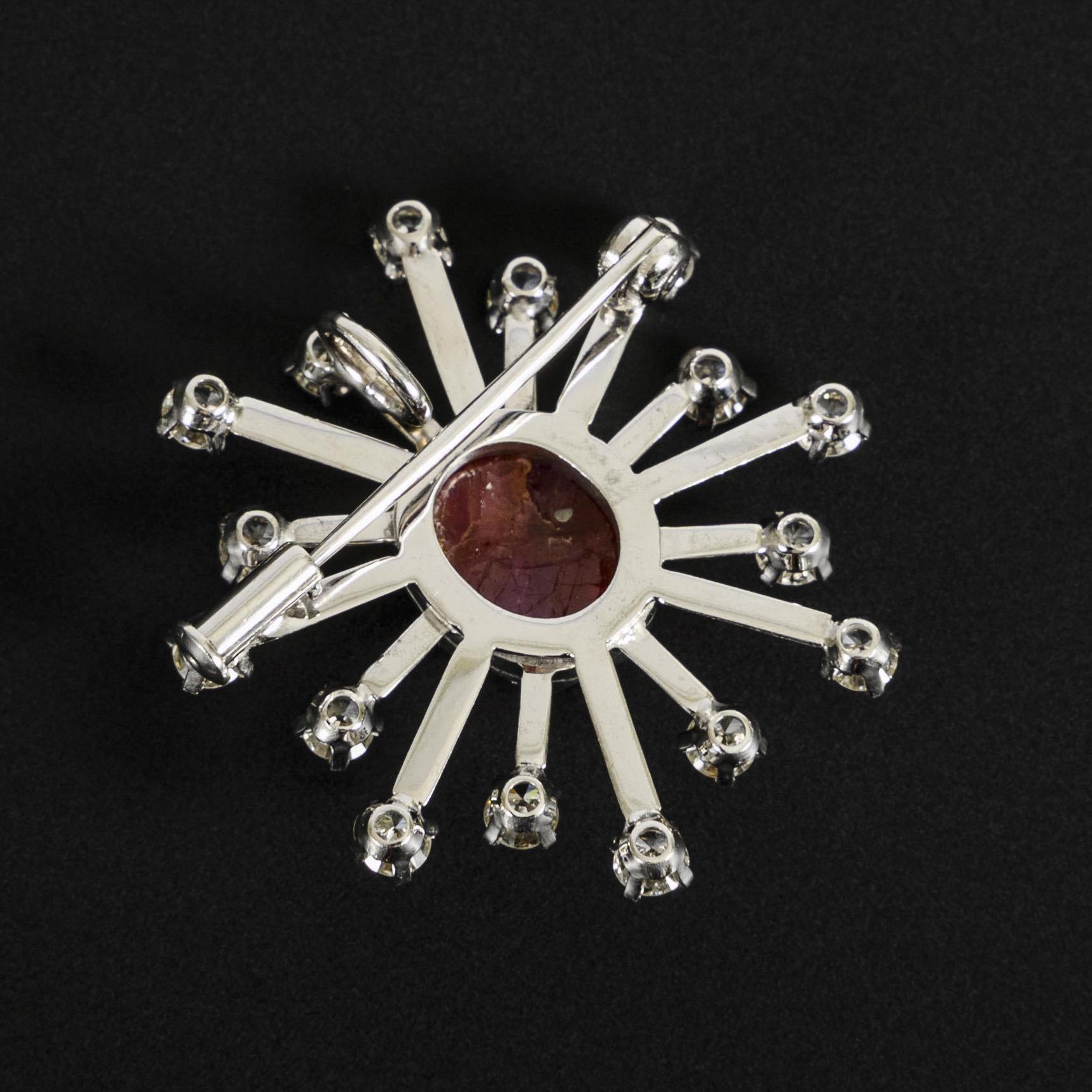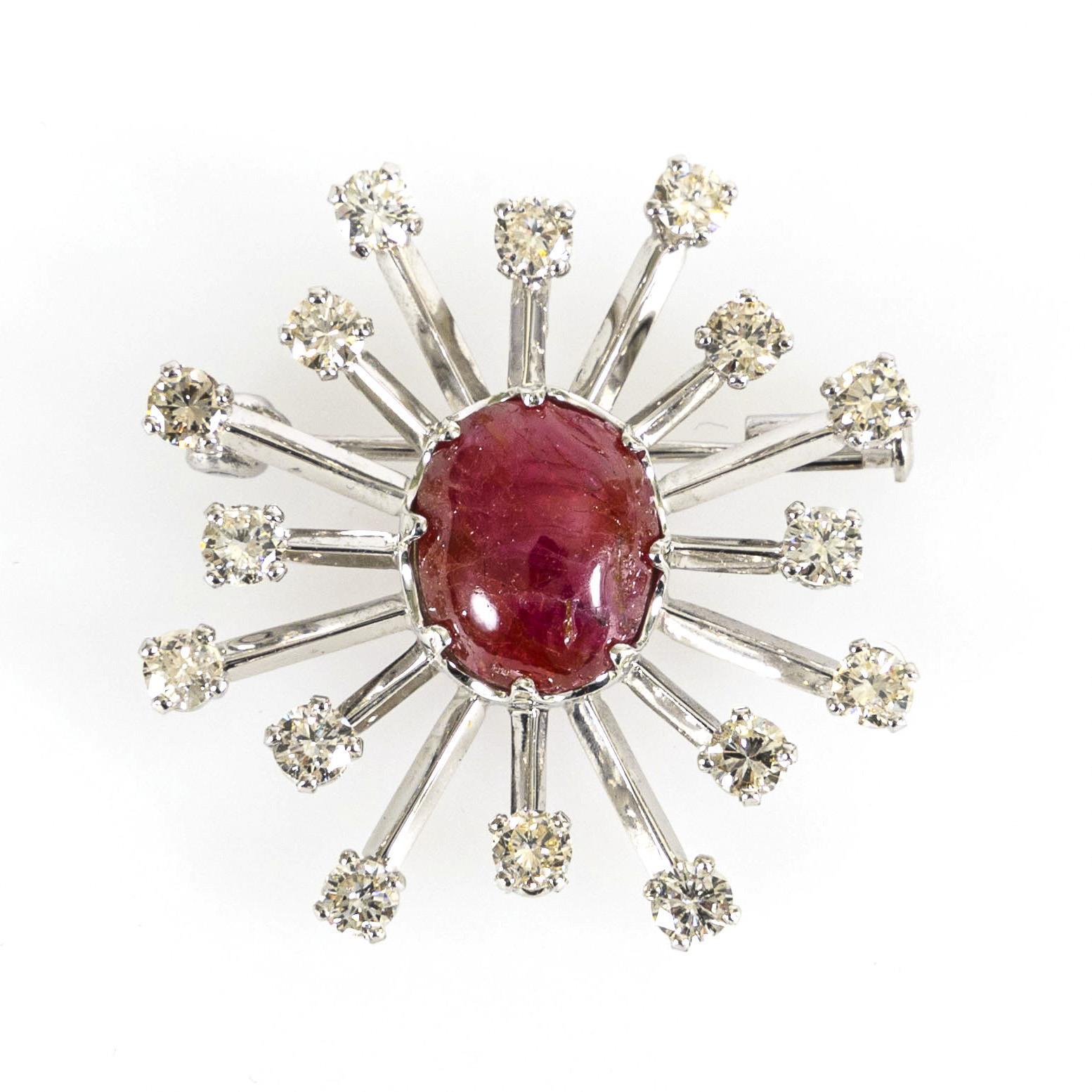 Striking star-shaped pendant brooch with a ruby cabochon surrounded by 16 brilliant-cut diamonds, the pin with sliding safety catch. Matching ear clip pair cat. no. 289. The ruby with very clear inclusions, therefore not cut perfectly true to shape.