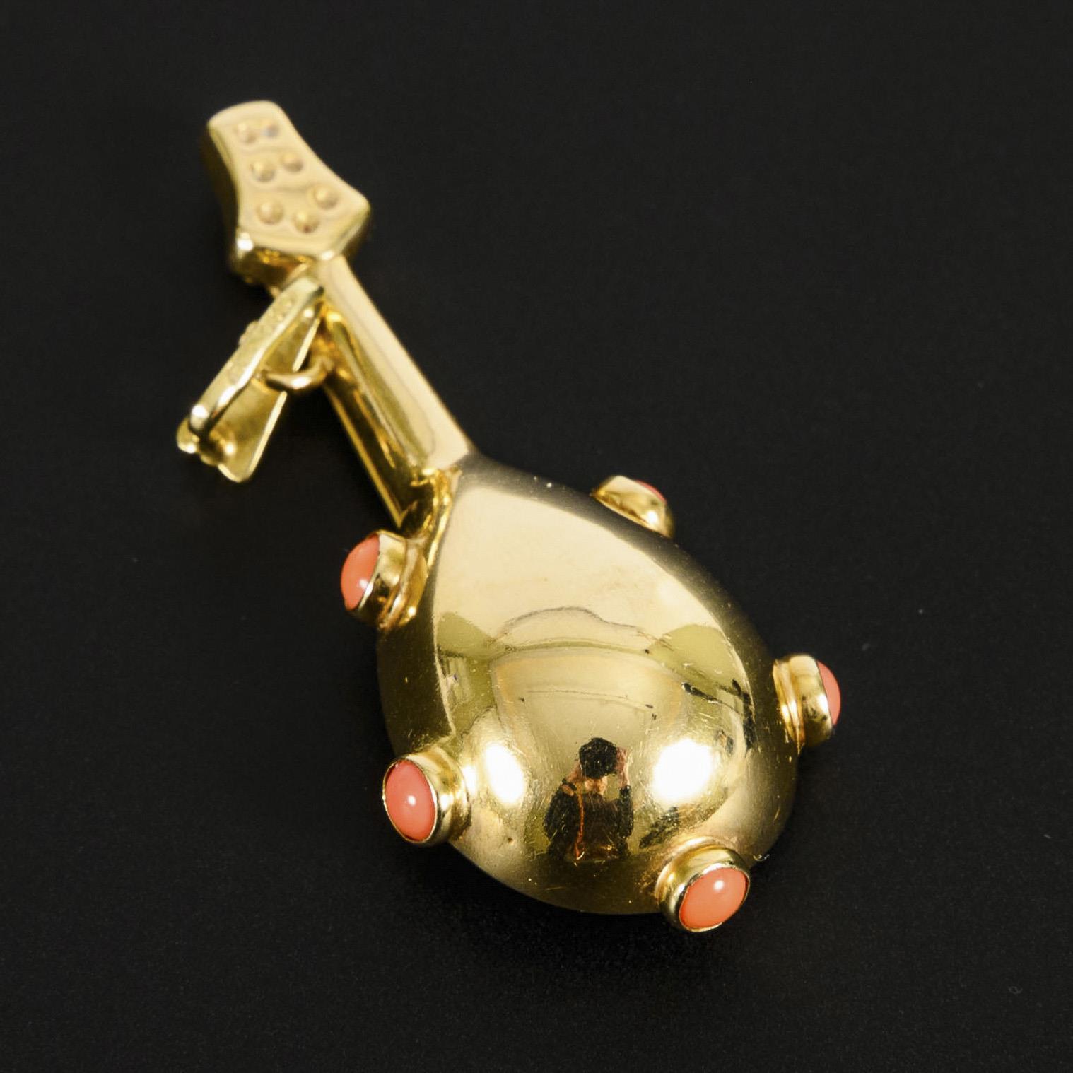 Pendant in the shape of a mandolin with 5 light red cabochons, probably coral.