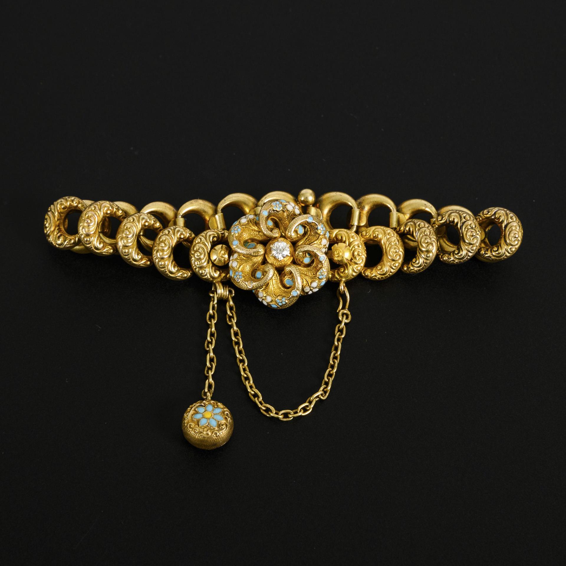 Historic bracelet with delicate enamel painting, old-cut diamonds and safety chain with small pendant. For matching brooch see cat. no. 48.