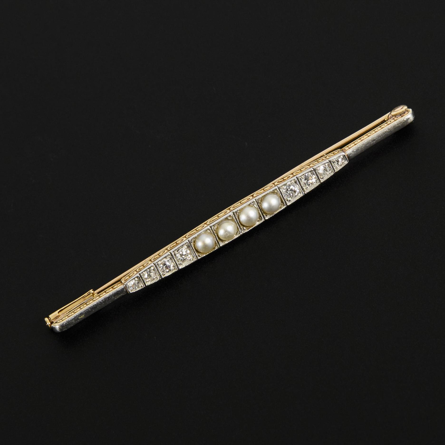 Elegant Art Deco pin with 4 half pearls and 8 old-cut diamonds in 2-tone design, the pin with sliding safety catch.
