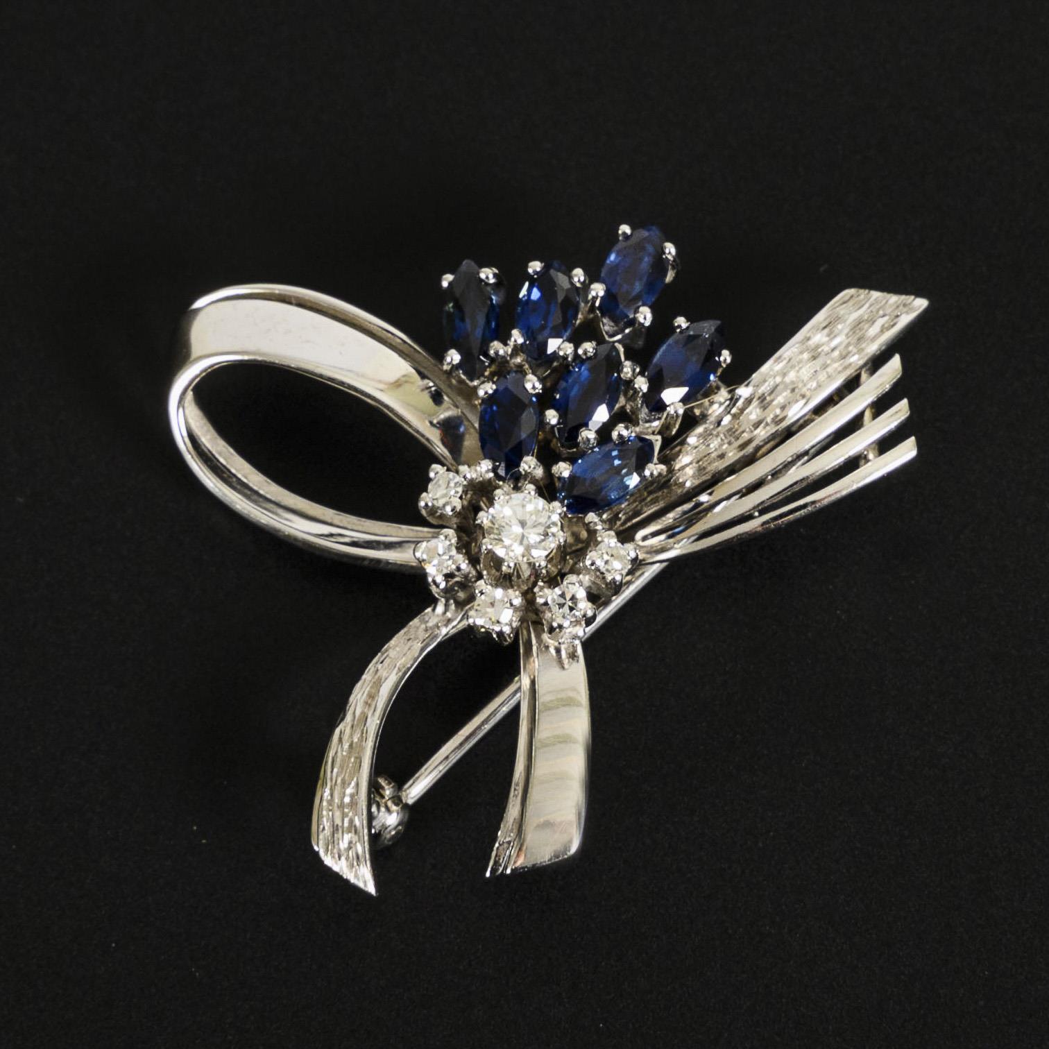 Modern bow or knot brooch set with a brilliant-cut diamond, 5 octagonal diamonds and 7 sapphire navettes.