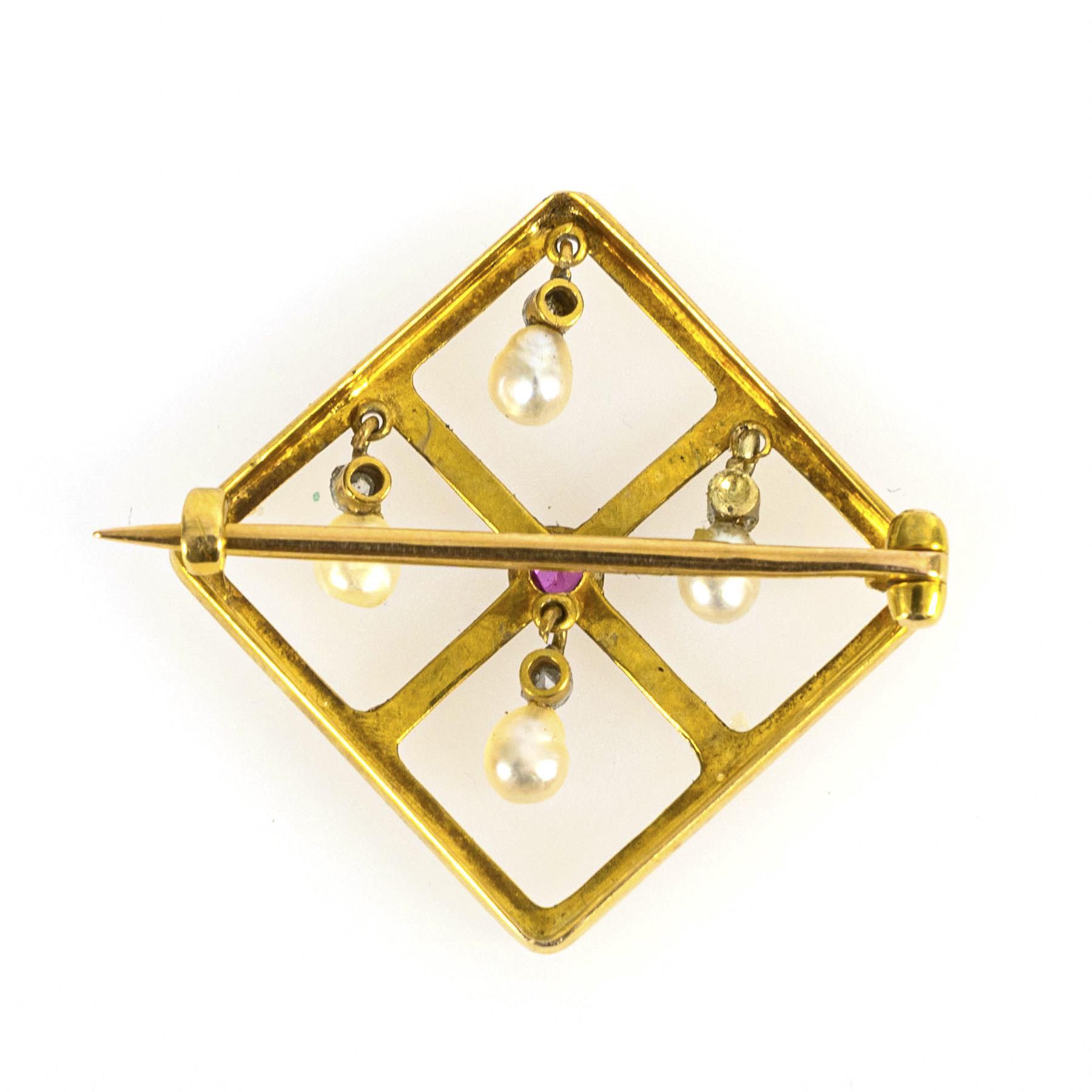 Geometric Art Nouveau brooch with a ruby, as well as 4 pendants each with a diamond rose and a probably natural pearl, the pin with a simple hook clasp. One diamond rose replaced by an octagonal diamond.