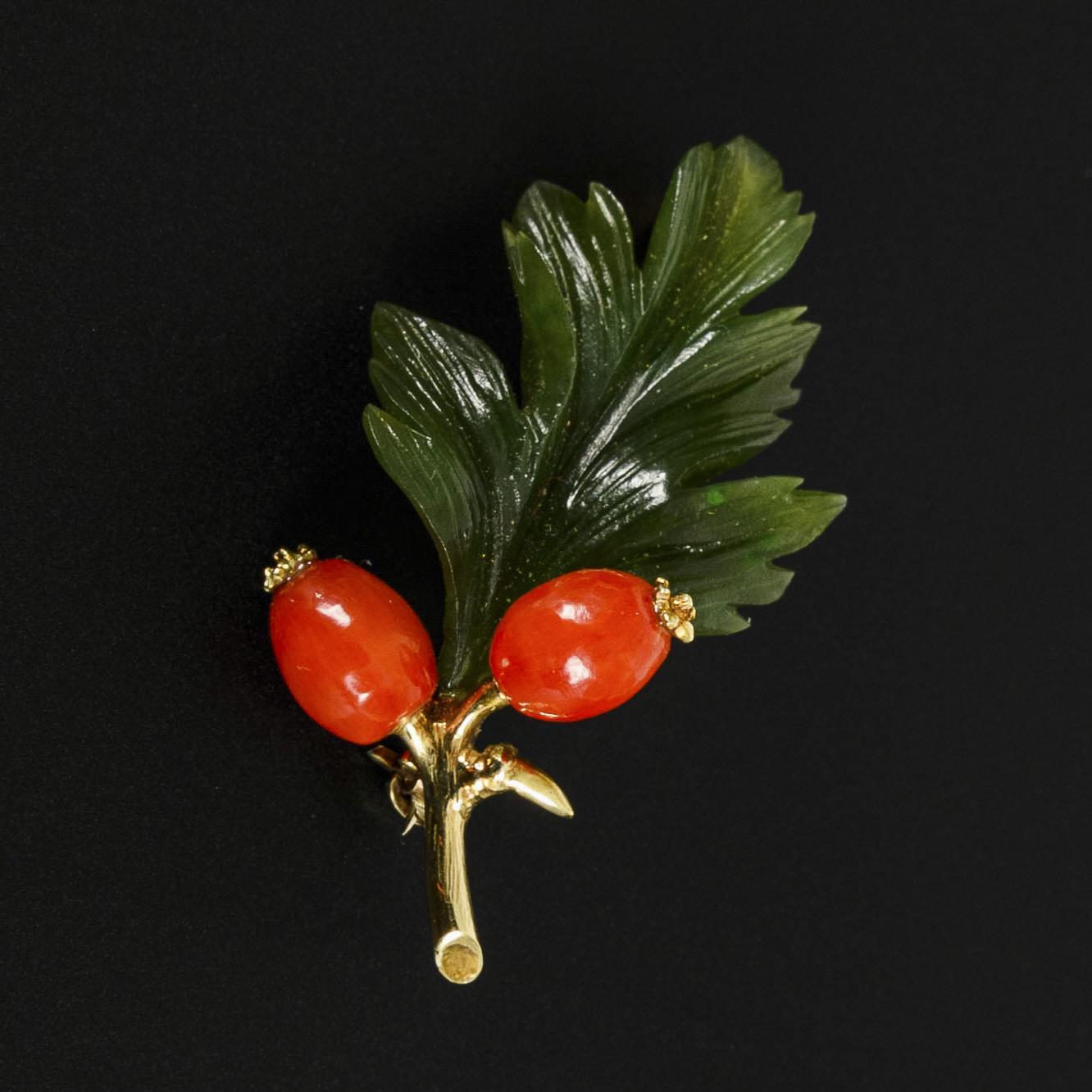 Ingeniously designed brooch as a rose hip branch, the two rose hips carved from nephrite jade on a leaf. The pin with a ball hook clasp.