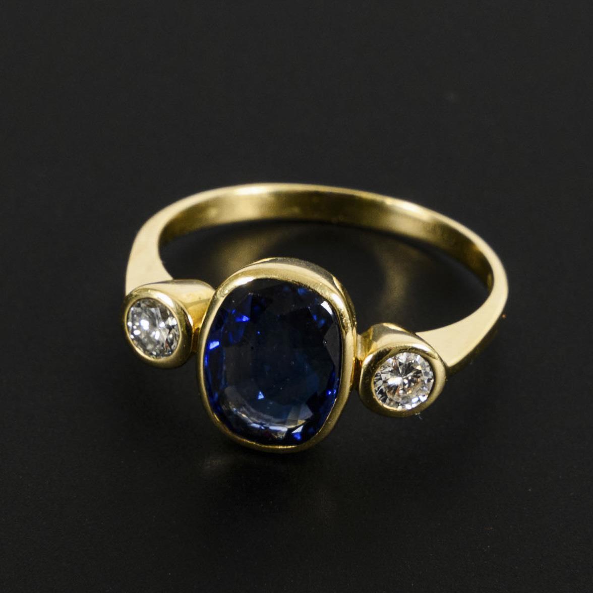 Bezel-set sapphire and 2 brilliant-cut diamonds, between narrow shank.