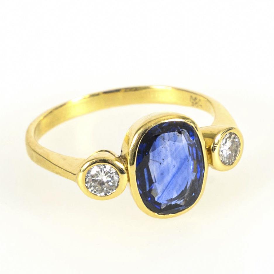 Marked yellow gold 585. Sapphire approx. 9.0 x 6.8 x 3.3 mm, approx. 1.60 ct. Diamonds together approx. 0.25 ct. White, medium degree of purity. Ring size 53. 3.3 g.