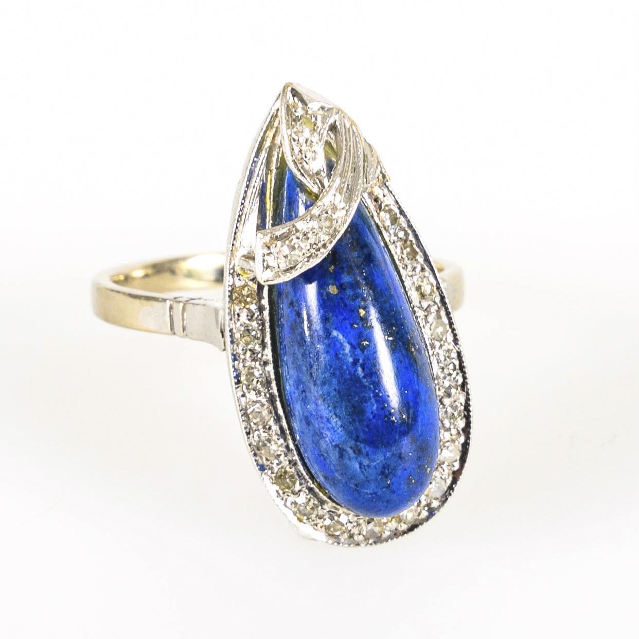 Ring head with drop-shaped lapis lazuli cabochon, surrounded by 21 octagonal diamonds, on a narrow band.
