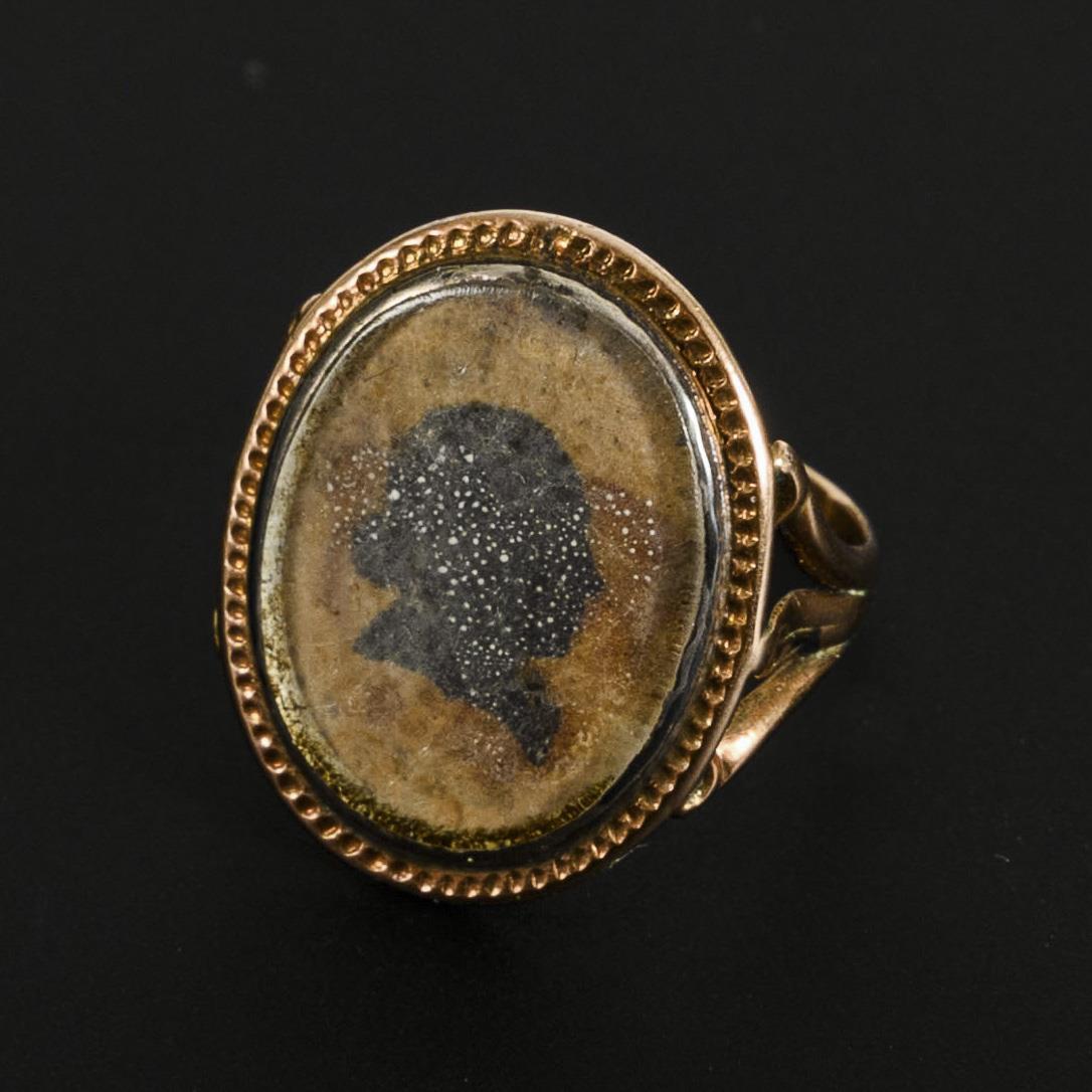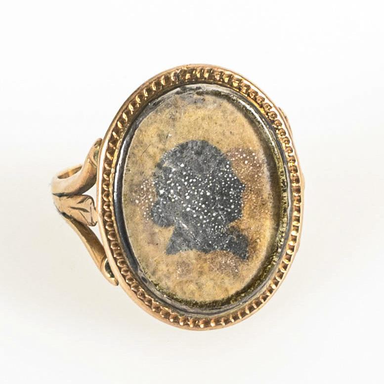 Portrait ring with a silhouette of a gentleman from the classicism period looking to the right, under glass, set in rose gold. Signs of wear to the glass overlay commensurate with age, the silhouette presumably damaged by previous contact with water, probably an earlier reduction of the ring band.
