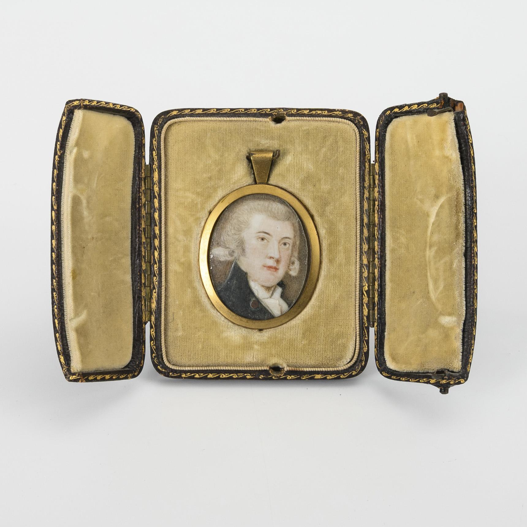 Gouache, glazed frame made of gilded brass. 2-door brown leather case with fold-out stand; light velvet inside. Miniature 4 x 3.5 cm (without frame), case 8 x 7 cm.