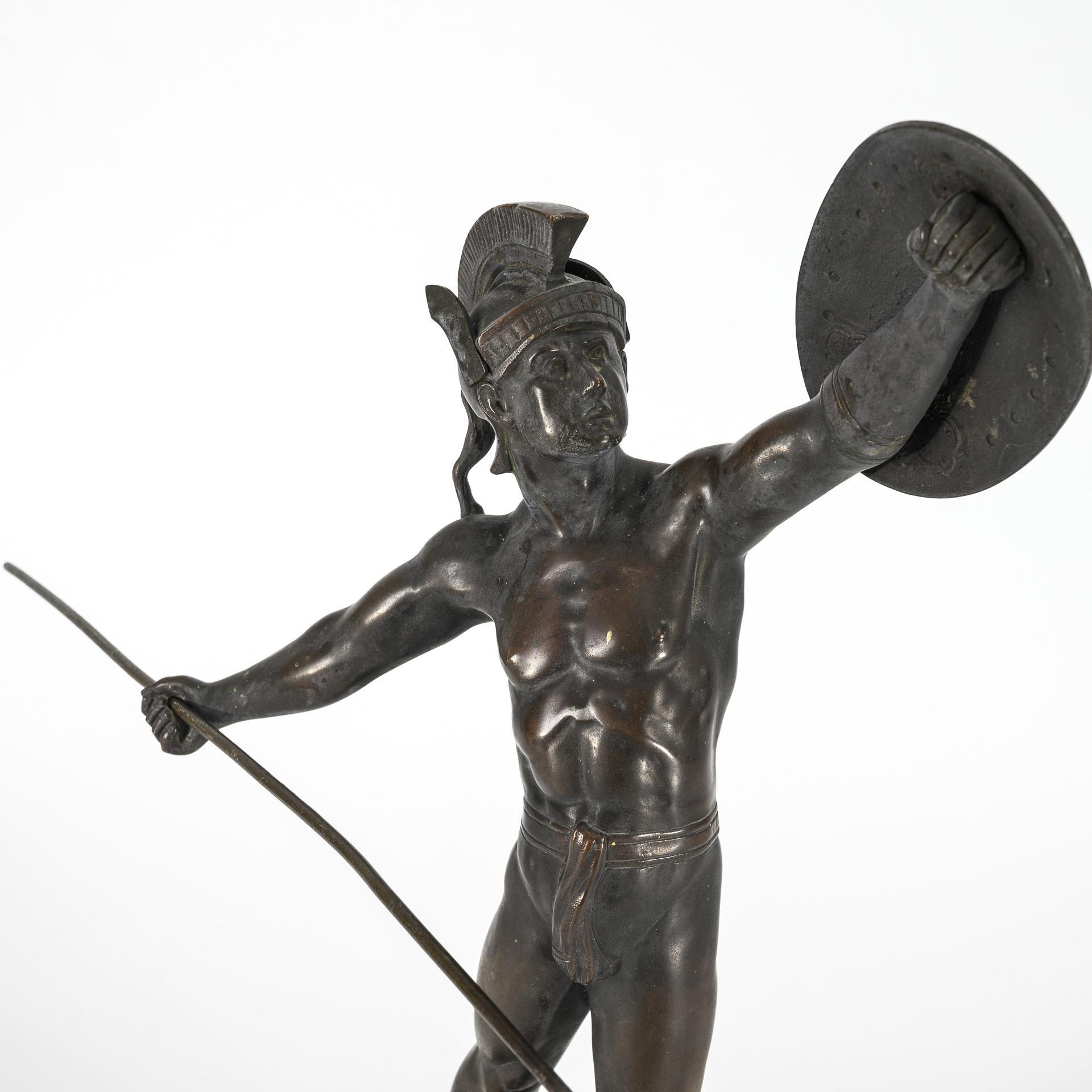 Ancient warrior with a raised shield, dressed only with a belt and helmet. Patina slightly stained and soiled, spear somewhat bent.