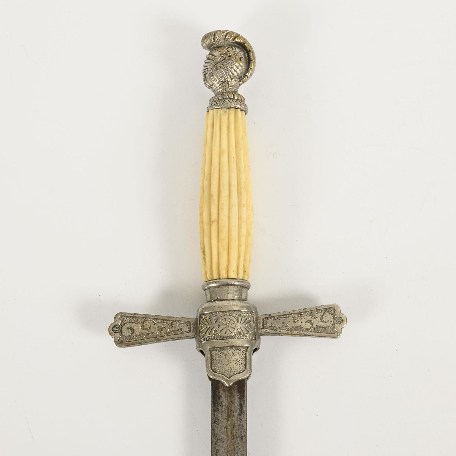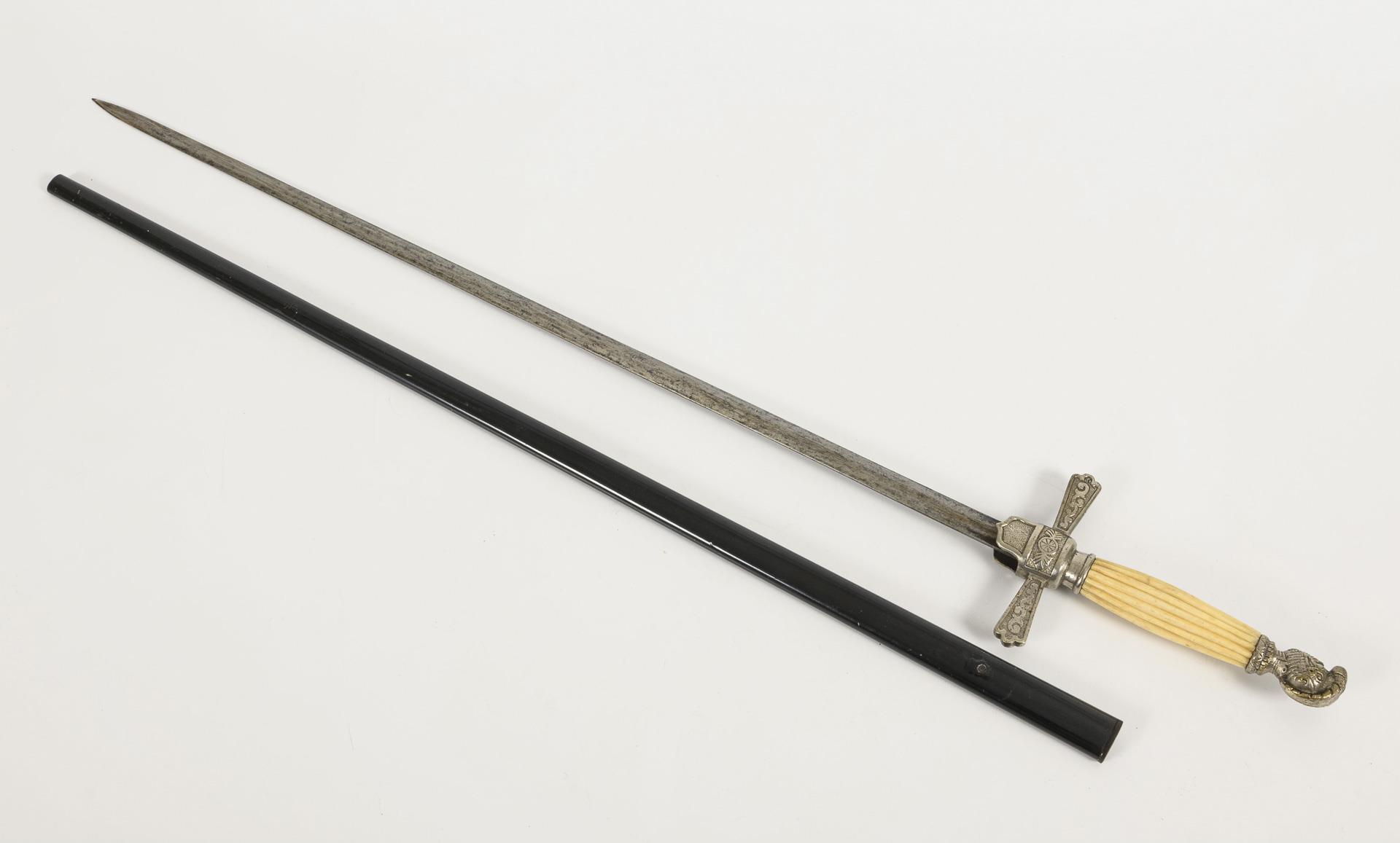 Straight, double-edged blade with lenticular cross-section, unsharpened. Crossguard, helmet pommel. Grip of longitudinally ribbed bone. Black metal scabbard.